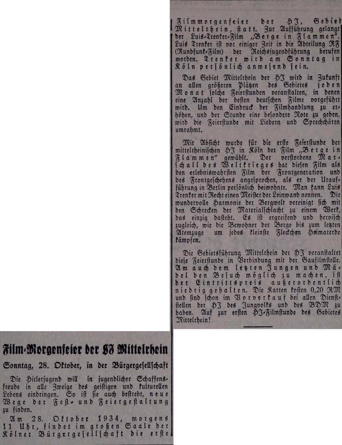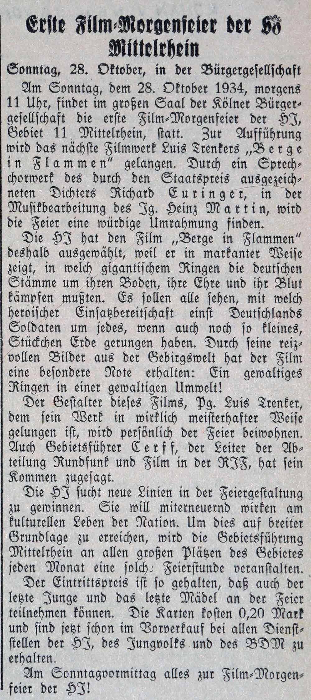 Um zu demonstrieren, dass sie auch "neue Wege der Fest- und Feiergestaltung" betritt, gestaltet die HJ Mittelrhein am 28. Oktober 1934 in der Kölner Bürgergesellschaft eine Film-Morgenfeier. Gezeigt wird der Luis-Trenker-FIlm "Berge in Flammen". Trenker selbst ist bei der Vorführung zugegen. Auch der Leiter der Abteilung Rundfunk und Film in der Reichsjugendführung, Gebietsführer Cerff, sagt sein Kommen zu.