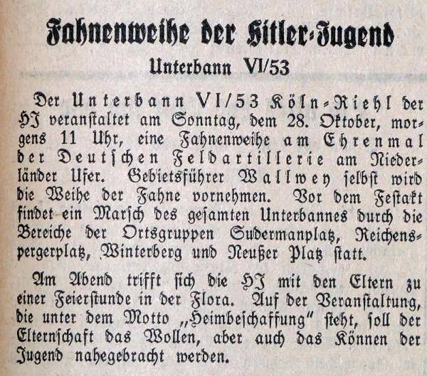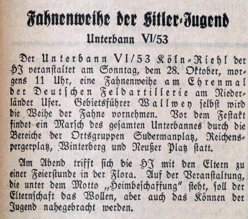 Der Unterbann VI/53 aus Köln-Riehl veranstaltet am 28. Oktober 1934 am Ehrenmal der Deutschen Feldartillerie am Niederländer Ufer eine Fahnenweihe. Vor dem Festakt findet ein Marsch des gesamten Unterbanns durch die Bereiche der Ortsgruppen Sudermanplatz, Reichenspergerplatz, Winterplatz und Neußer Platz statt.
