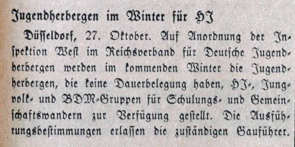 Auf Anordnung der Inspektion West im Reichsverband für Deutsche Jugendherbergen werden im Winter 1934/35 die Jugendherbergen, die keine Dauerbelegung haben, HJ und BDM für Schulungs- und Gemeinschaftswanderungen zur Verfügung gestellt.