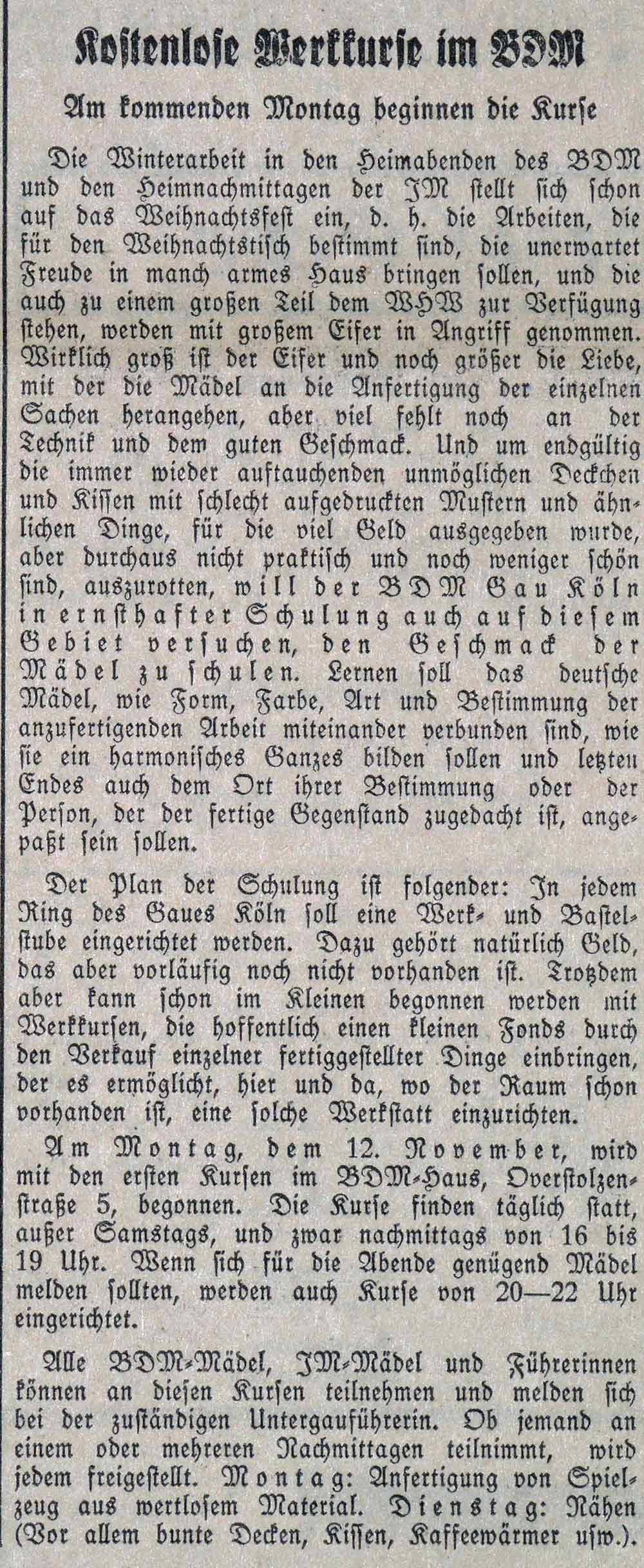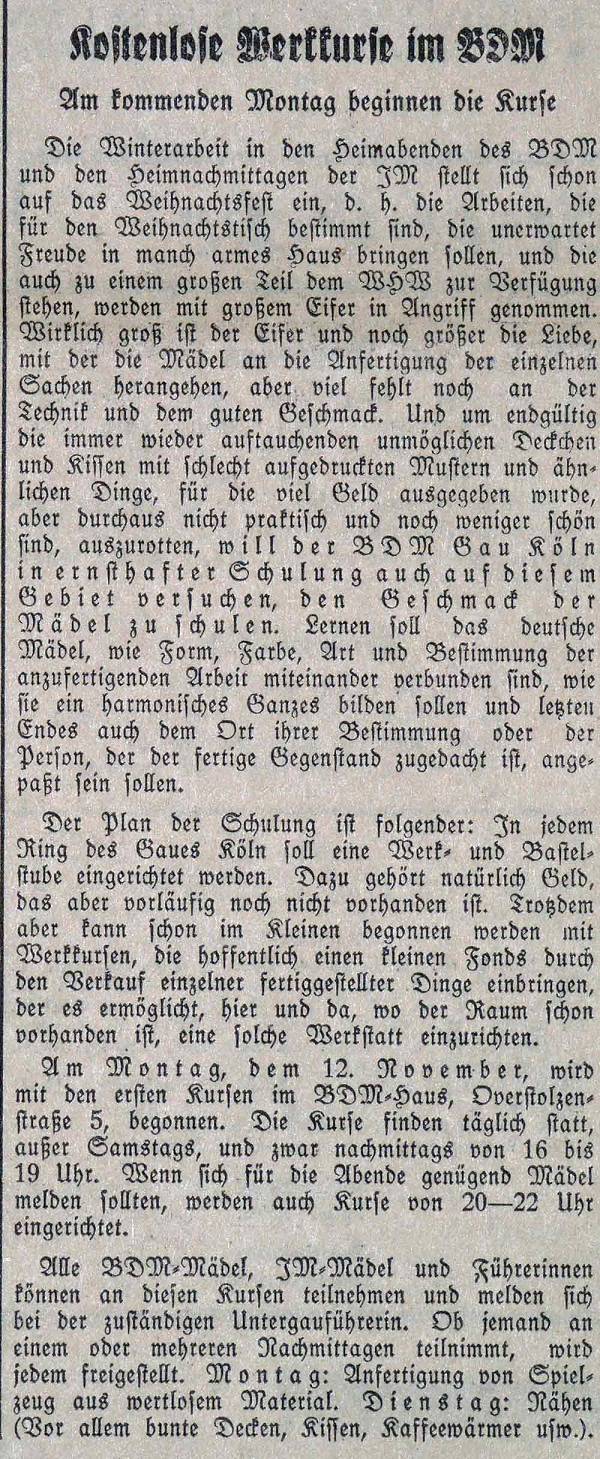 Um jedoch schon "im Kleinen" zu beginnen, wird ab dem 12. November mit den ersten Kursen im BDM-Haus in der Overstolzenstraße 5 begonnen. Die Kurse finden täglich außer samstags von 16 bis 19 Uhr statt. Alle Mitglieder von BDM und JM können daran teilnehmen. Ein Kurs widmet sich der Anfertigung von Spielzeug aus "wertlosem Material", ein anderer dem Nähen von Wohnraumtextilien.
