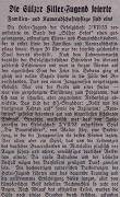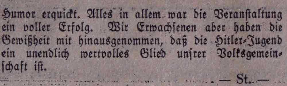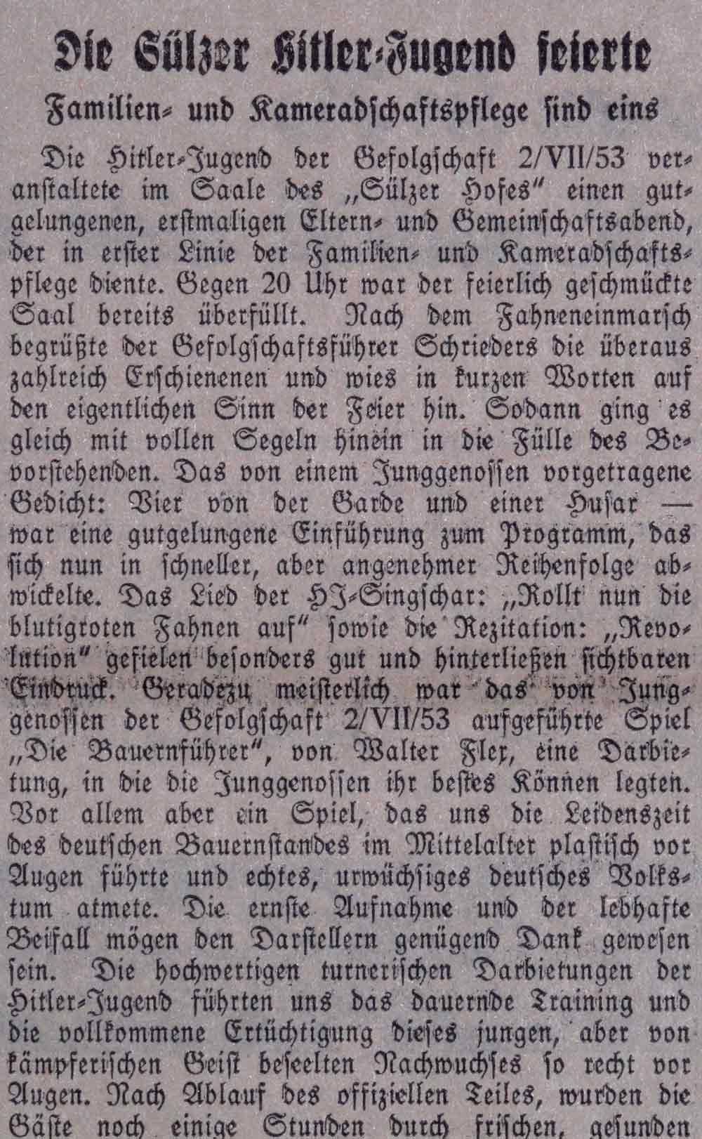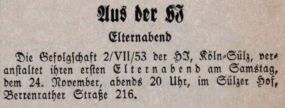 Die Gefolgschaft 2/VII/53 aus Köln-Sülz veranstaltet im Sülzer Hof in der Berrenrather Straße 216 am 24. November 1934 ihren ersten Elternabend. Nach der Begrüßung von Gefolgschaftsführer Schrieders werden Gedichte, Lieder (u.a. "Rollt nun die blutigroten Fahnen auf") und das Spiel "Die Bauernführer" von Walter Flex vorgetragen.