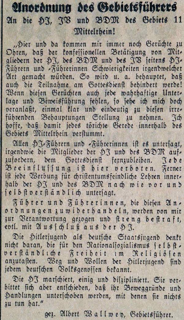 Der Führer des Gebietes Mittelrhein, Wallwey, nimmt am 2. Dezember 1934 im Westdeutschen Beobachter Stellung zu - von ihm allerdings für nicht glaubwürdig gehaltenen - "Gerüchten", dass HJ-Mitglieder an der Teilnahme am Gottesdienst gehindert würden. Dies sei verboten: "Allen HJ-Führern und -Führerinnen ist es untersagt, irgendwie die Mitglieder der HJ und des BDM aufzufordern, dem Gottesdienst fernzubleiben. Jede Beeinflussung ist hier verboten. Ferner ist jede Werbung für christentumsfeindliche Lehren innerhalb der HJ und des BDM nach wie vor und selbstverständlich untersagt.