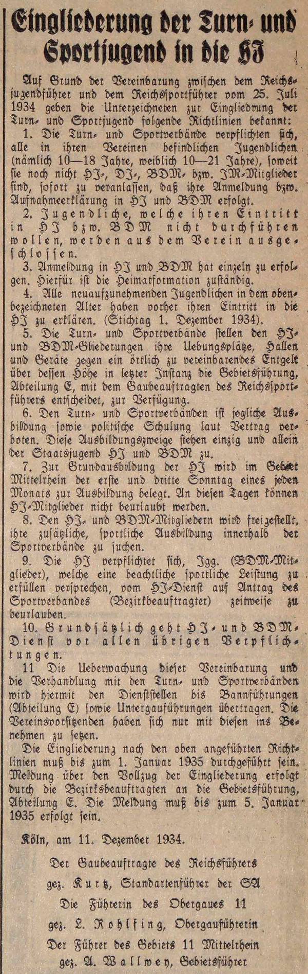 Aufgrund der Vereinbarung zwischen dem Reichsjugendführer und dem Reichssportführer vom 25. Juli 1934 geben in Köln der Gaubeauftragte des Reichsführers, Kurtz, die Führerin des Obergaues Mittelrhein, Rohlfing, und der Führer des Gebietes Mittelrhein, Wallwey, am 11. Dezember 1934 die Richtlinien für die Eingliederung der Turn- und Sportjugend in die HJ bekannt.