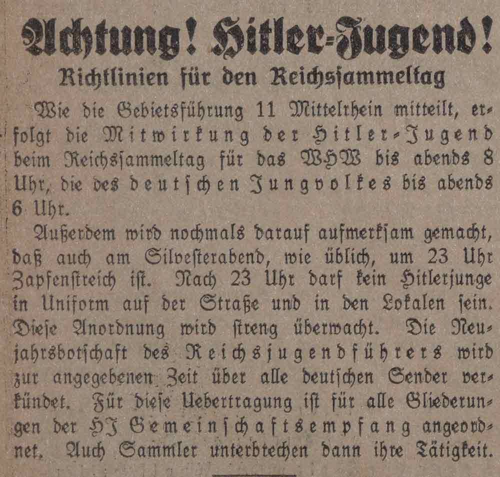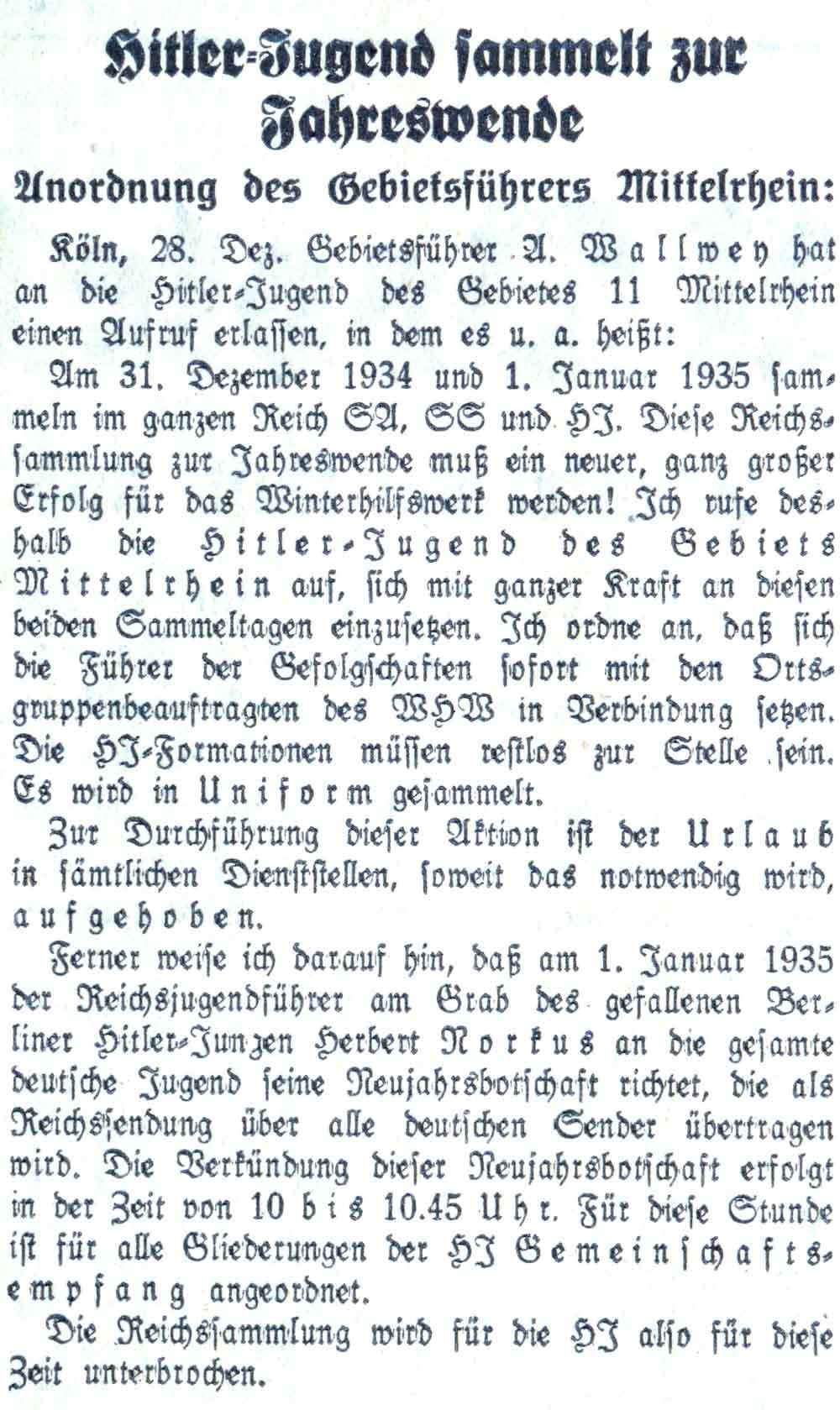 Der Führer des Gebietes Mittelrhein, Wallwey, ordnet am 28. Dezember 1934 an, dass die HJ am 31. Dezember 1934 und 1. Januar 1935 gemeinsam mit SA und SS für das WHW sammelt.