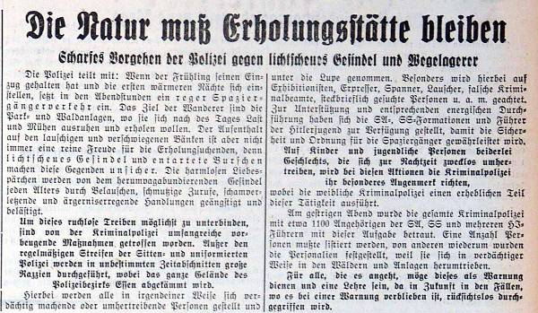 Am gestrigen Abend wurde die gesamte Kriminalpolizei mit etwa 1100 Angehörigen der SA und SS und mehreren HJ-Führern mit dieser Aufgabe betraut. Eine Anzahl von Personen musste sistiert werden, von anderen wiederum wurden die Personalien festgestellt, weil sie sich in verdächtiger Weise in den Wäldern und Anlagen herumtrieben.