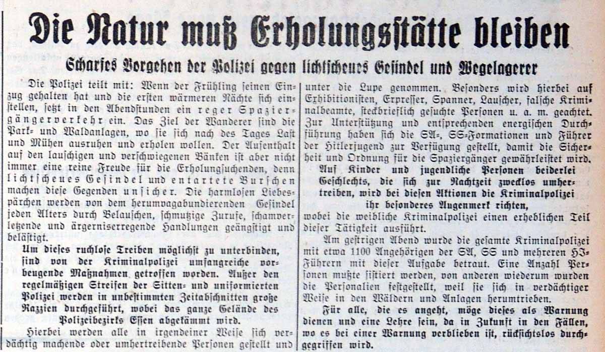 Um dieses ruchlose Treiben möglichst zu unterbinden, sind von der Kriminalpolizei umfangreiche vorbeugende Maßnahmen getroffen worden. Ausser den regelmässigen Streifen der Sitten- und uniformierten Polizei werden in unbestimmten Zeitabschnitten große Razzien durchgeführt, wobei das ganze Gelände des Polizeibezirks Essen abgekämmt wird. (...)
