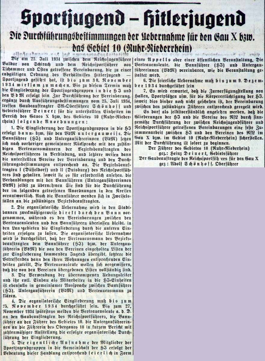 "Die am 25. Juni 1934 zwischen dem Reichsjugendführer Baldur von Schirach und dem Reichssportführer von Tschammer und Osten getroffene Vereinbarung, die zu einer endgültigen Ordnung des Verhältnisses Hitlerjugend - Sportjugend geführt hat, ist bis zum 30. November 1934 wirksam zu machen. Bis zu diesem Termin muss die Eingliederung der Sportjugendgruppen in die HJ und den BDM erfolgt sein."