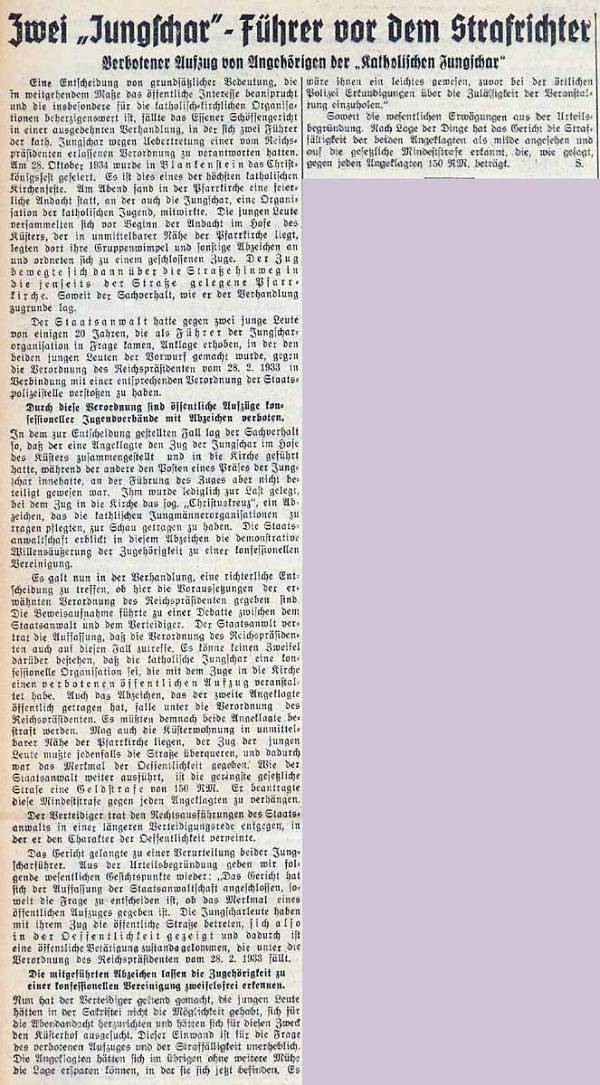 "Verbotener Aufzug von Angehörigen der 'katholischen Jungschar'", so lauten die Schlagzeilen einen Artikels aus des Essener Nationalzeitung vom 09. Februar 1935, der sich auf einen Vorfall vom 29. Oktober 1934 bezieht. In dem Artikel heißt es: