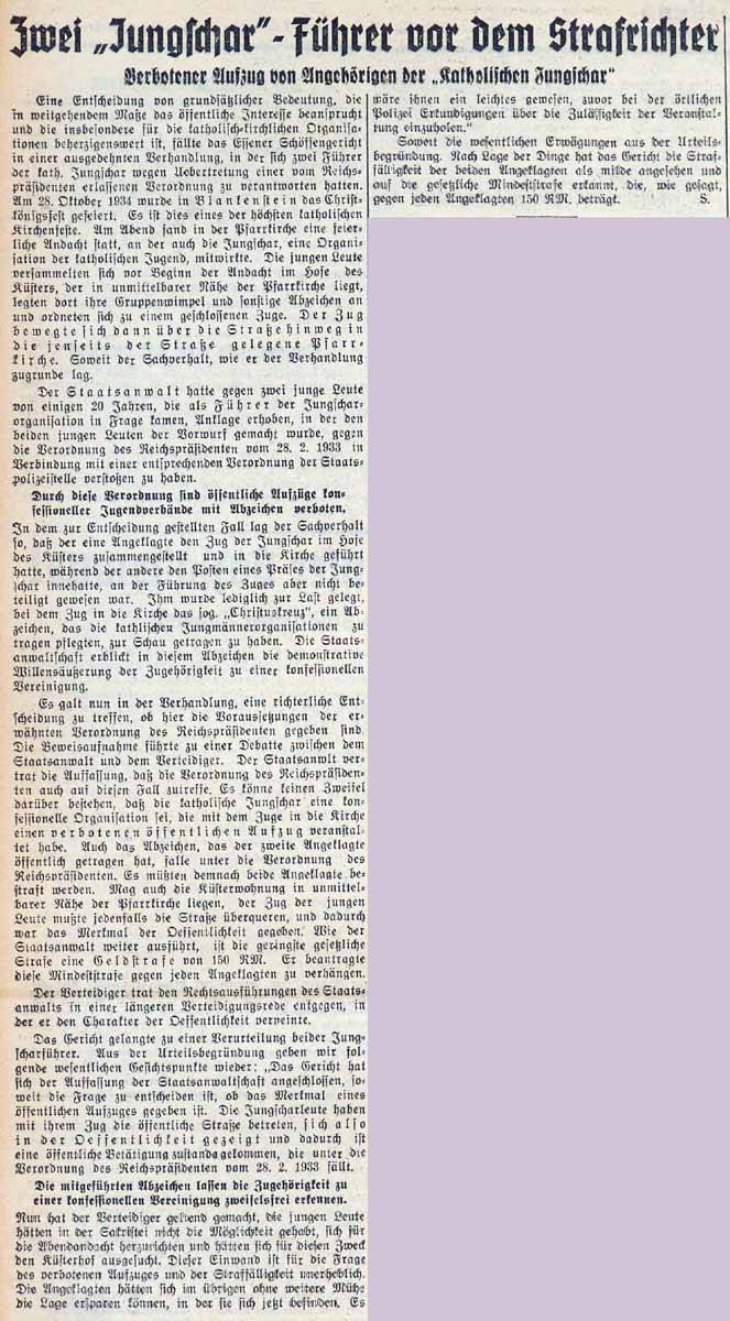 Der Vorwurf gegen den einen Angeklagten lautete, dass er die Jungschar im Hofe des Küsters zusammengestellt und in die Kirche geführt habe. Der andere Angeklagte war zwar an der Führung des Zuges nicht beteiligt, aber habe den Posten des Präses in der Jungschar inne. Ihm wurde vorgeworfen, beim Zug in die Kirche das 'Christenkreuz' der katholischen Jungmänner zu Schau gestellt zu haben. "Die Staatsanwaltschaft erblickte in diesem Abzeichen die demonstrative Willensäußerung der Zugehörigkeit zu einer konfessionellen Vereinigung. (...) Das Gericht gelangte zu einer Verurteilung beider Jungscharführer. (...) Nach Lage der der Dinge hat das Gericht die Straffälligkeit der beiden Angeklagten als milde angesehen und auf die gesetzliche Mindeststrafe erkannt, die, wie gesagt, gegen jeden Angeklagten 150 RM beträgt."
