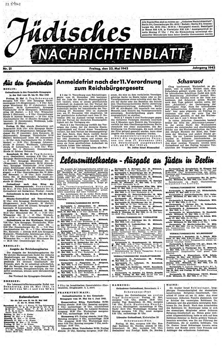 Zum Monatsbeginn ordnete der Reichsführer-SS am 1. Mai ein Verbot der Benutzung öffentlicher Verkehrsmittel durch die jüdische Bevölkerung an. Dabei wurde ausdrücklich hervorgehoben, dass die neuen Bestimmungen genauestens beobachtet und bei Zuwiderhandlungen seitens der Staatspolizei bestraft würden. Eine Woche später wurde diese Verordnung nochmals dahingehend präzisiert, dass Erlaubnisscheine zur Benutzung öffentlicher Verkehrsmittel von Jüdinnen und Juden grundsätzlich nur zu Berufsfahrten und zum Schulbesuch benutzt werden dürften.