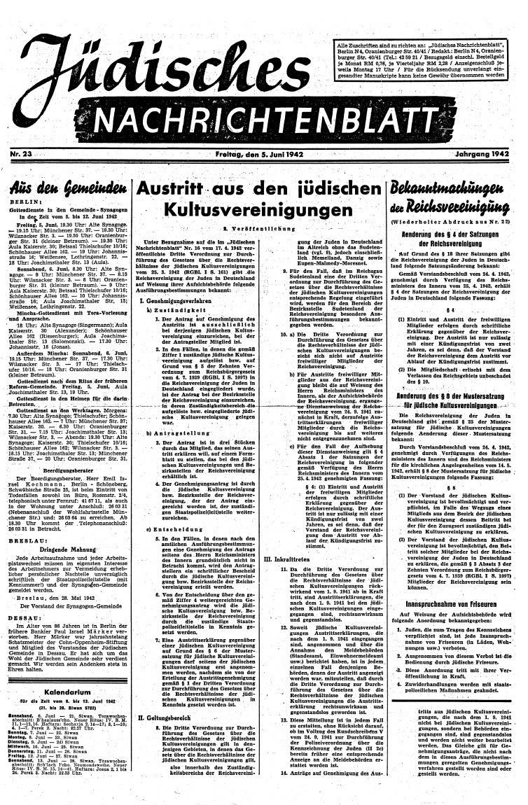 30. Juni 1942: Reichsvereinigung der Juden an die Jüdischen Kulturvereinigungen