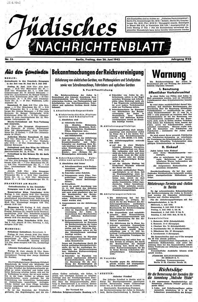 Auch der Juni brachte zahlreiche weitere Einschränkungen im alltäglichen Leben der jüdischen Bevölkerung. Es begann a, 6. Juni mit einem Erlass des Reichsverkehrsministers, der Jüdinnen und Juden die Benutzung von Warteräumen, Wirtschaften und sonstigen Einrichtungen der Verkehrsbetriebe untersagte. Drei Tage darauf folgte die Anordnung, dass die jüdische Bevölkerung sämtliche entbehrlichen Kleidungsstücke abzuliefern habe. Am 11. Juni wurde ihr mitgeteilt, dass sie künftig - mit Ausnahme für Kriegsbeschädigte und Angehörige privilegierter Mischehen - keine Raucherkarten mehr ausgehändigt würden. Wiederum nur einen Tag später wurde angeordnet, dass der „Judenstern“ nun auch auf der Arbeitskleidung befestigt werden müsse. Am gleichen 12. Juni wurden Jüdinnen und Juden - wiederum mit Ausnahme von Angehörigen privilegierter Mischehen - seitens des Reichssicherheitshauptamtes verpflichtet, umgehend sämtliche in ihrem Besitz befindlichen elektrischen Geräte, optische Geräte, Fahrräder, Fotoapparate, Ferngläser und mehr ohne jede Entschädigung abzuliefern. Zuwiderhandlungen gegen diese Anordnung würden „mit schärfsten staatspolizeilichen Maßnahmen“ geahndet. Ab dem 22. Juni war die jüdische Bevölkerung vom Bezug von Eiern ausgeschlossen, ab dem 26. Juni durfte sie keine Fahrkartenautomaten mehr benutzen.