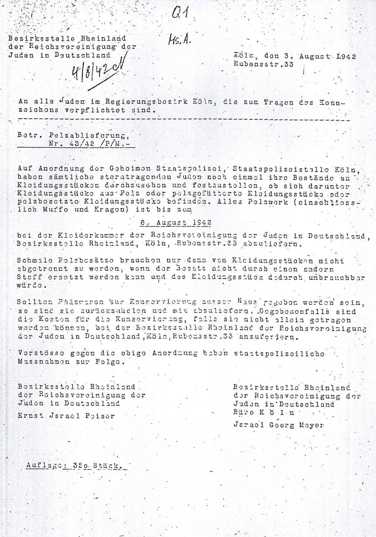 Auf Anordnung der Geheimen Staatspolizei, Staatspolizeistelle Köln, haben sämtliche sterntragenden Juden noch einmal ihre Bestände an Kleidungsstücken durchzusehen und festzustellen, ob sich darunter Kleidungsstücke aus Pelz oder pelzgefütterte Kleidungsstücke oder pelzbesetzte Kleidungsstücke befinden. Alles Pelzwerk (einschließlich Muffe und Kragen) ist bis zum