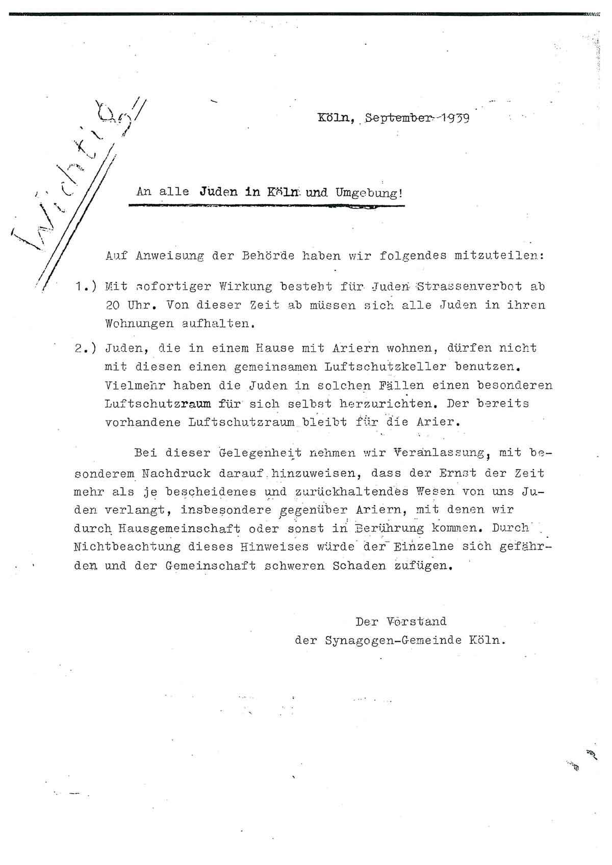 Mitteilung der Synagogen-Gemeinde Köln über Ausgangssperre und Luftschutzräume