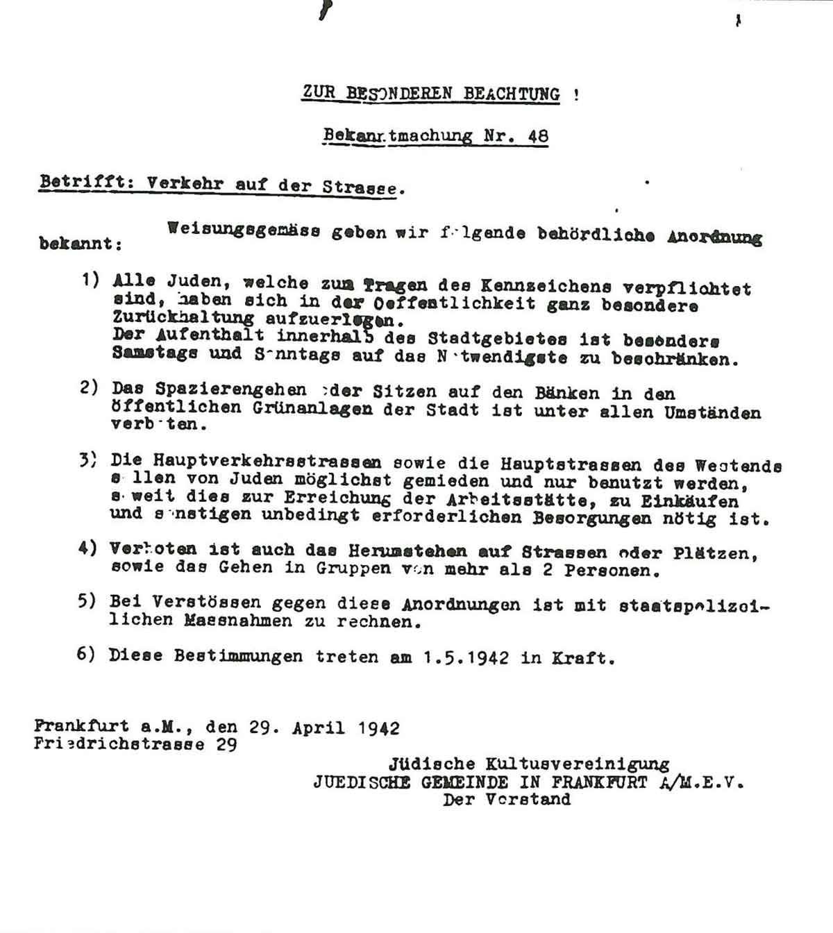 Bekanntmachung der Jüdischen Gemeinde Frankfurt zum „Verkehr auf der Straße“