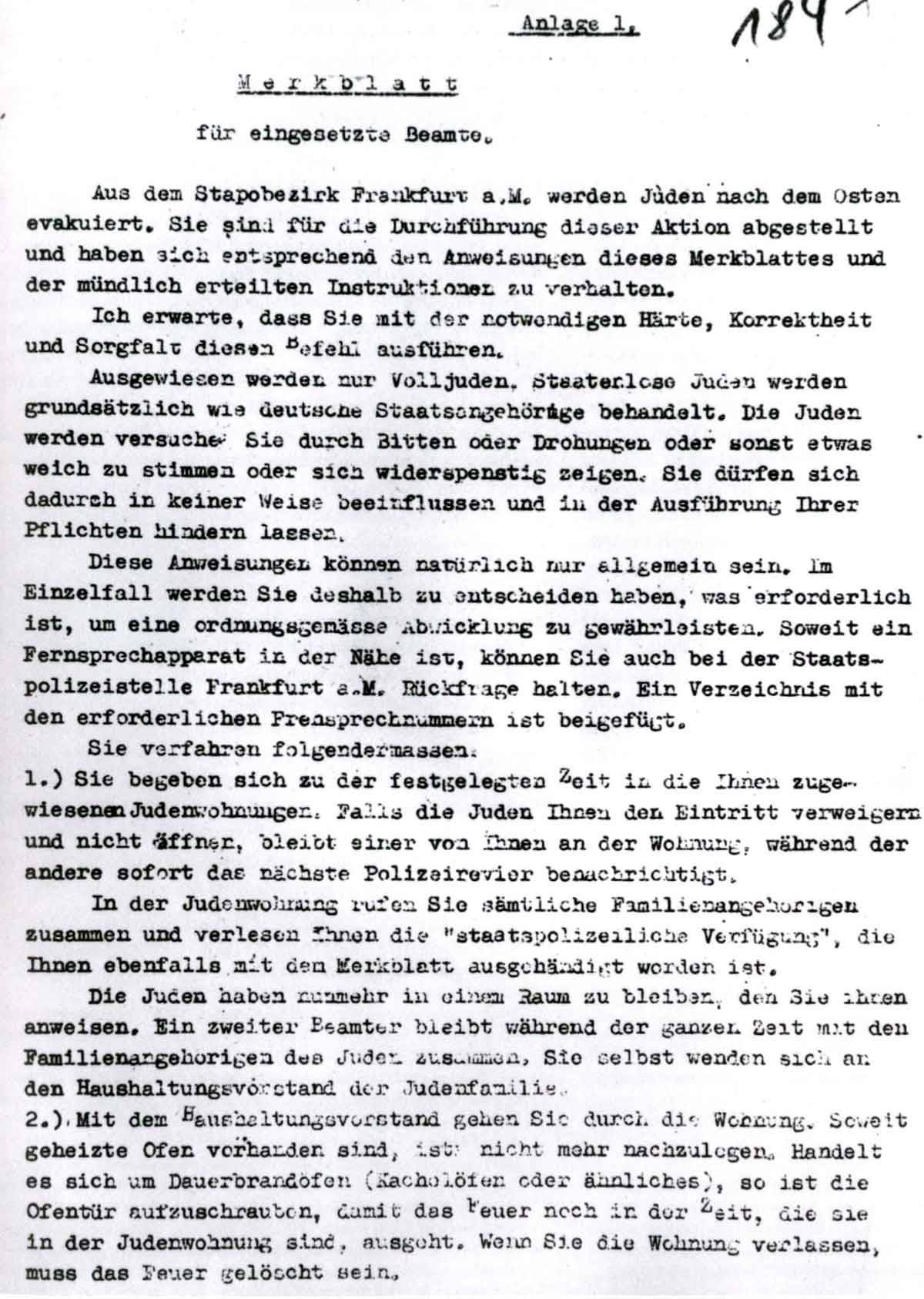 Aus dem Stapobezirk Frankfurt a.M. werden Juden nach dem Osten evakuiert. Sie sind für die Durchführung dieser Aktion abgestellt und haben sich entsprechend den Anweisungen dieses Merkblattes und der mündlich erteilten Instruktionen zu verhalten.