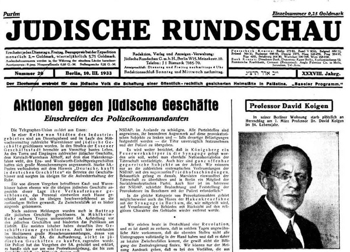Der März begann turbulent und ließ erahnen, was künftig auf die jüdische Bevölkerung zukommen könnte. Am 6. März, also unmittelbar nach der Reichstagswahl, begannen Angriffe von Nationalsozialisten gegen Juden auf dem Berliner Kurfürstendamm, die am 9. März einen ersten blutigen Höhepunkt erlebten. Die Ausschreitungen beschränkten sich jedoch bald nicht mehr nur auf Berlin. Auch im Rheinland und in Magdeburg blockierten SA-Männer am 9. März vereinzelt jüdische Warenhäuser und Geschäfte. In Chemnitz zwangen SA und Stahlhelm jüdische Beamte zum Verlassen des Amtsgerichts; ähnliches geschah in mehreren schlesischen Städten.