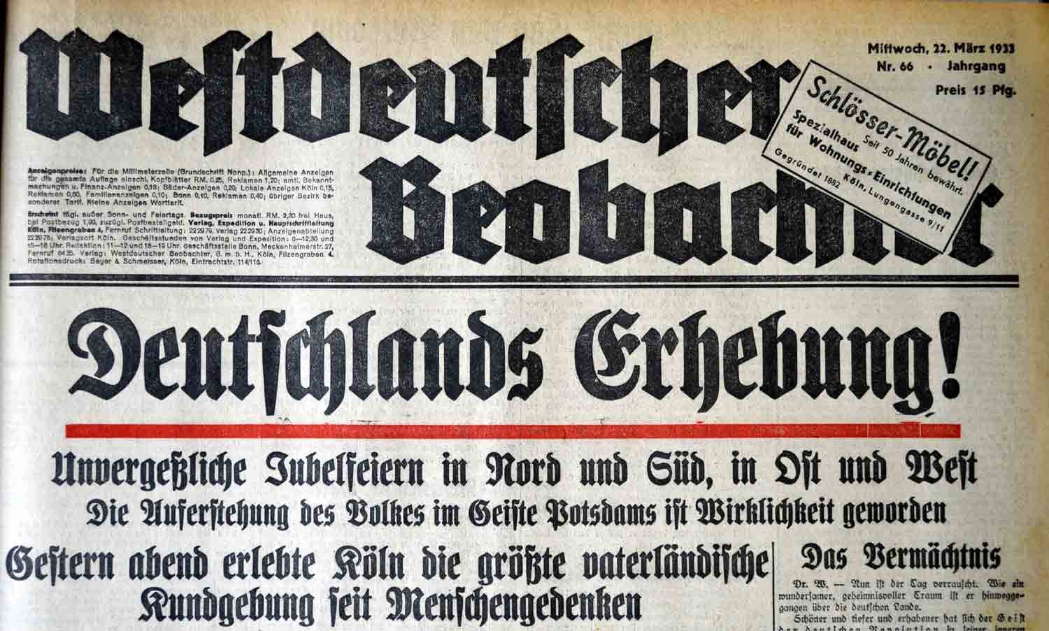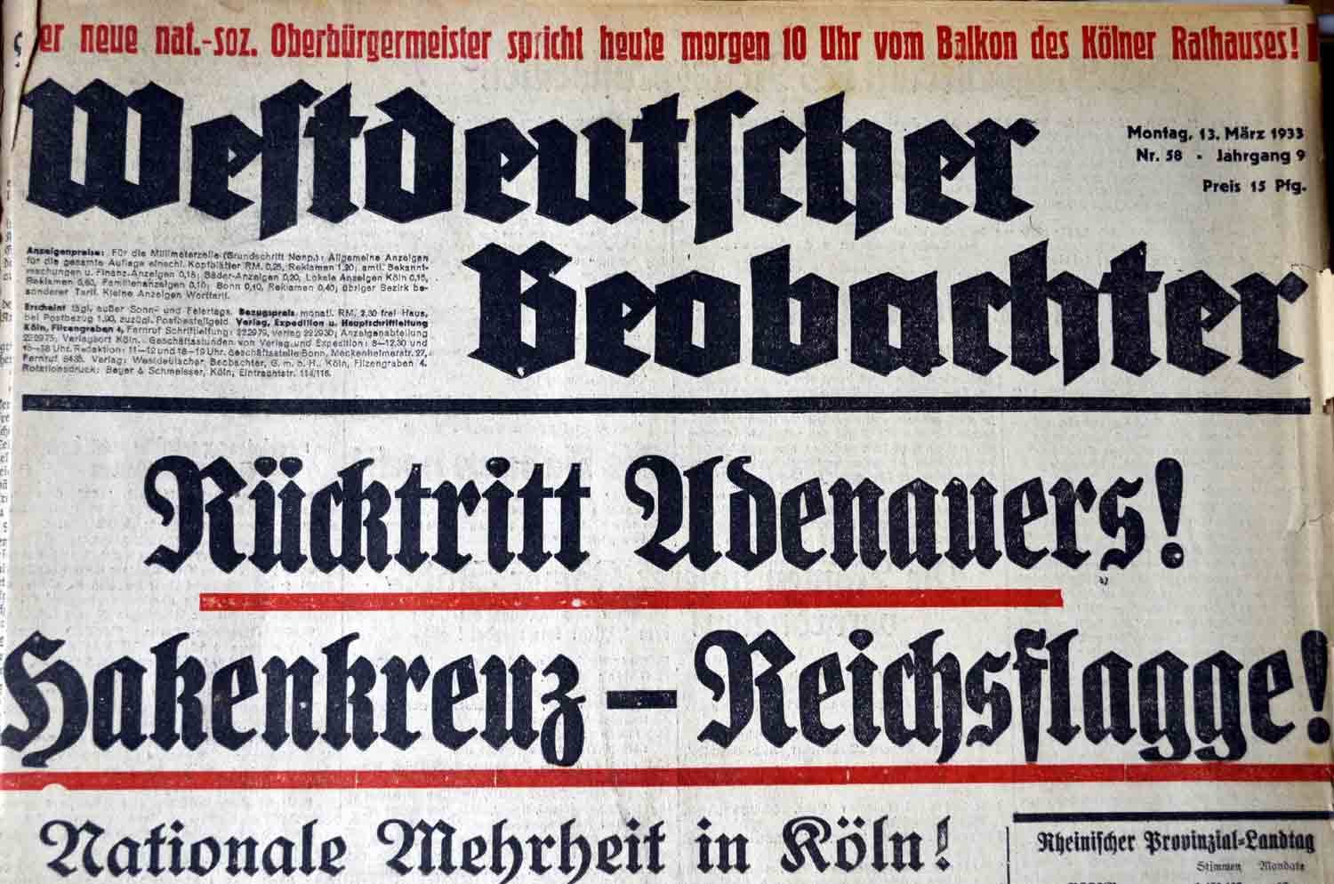 Nachdem am 12. März auch die Kommunalwahlen in Preußen absolviert waren, verlas Hitler einen Erlass Hindenburgs, wonach vom nächsten Tag an „bis zur endgültigen Regelung der Reichsfarben die schwarz-weiß-rote Fahne und die Hakenkreuzfahne gemeinsam“ zu hissen seien, um so die „ruhmvolle Vergangenheit des Deutschen Reiches und die kraftvolle Wiedergeburt der deutschen Nation“ zu verknüpfen. Die NSDAP hatte sich im politischen Bereich zumindest formal weitgehend durchgesetzt.