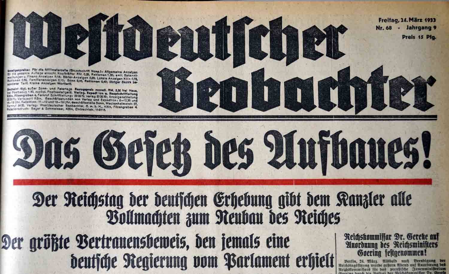 Zwei Tage nach dem Potsdamer Propagandaakt wurde am 23. März das sogenannte „Ermächtigungsgesetz“ verabschiedet. Hierzu war eine Zweidrittelmehrheit der Reichstagsabgeordneten notwendig, die jedoch problemlos erreicht wurde: Die Vorlage wurde mit 441 Stimmen angenommen, während es lediglich die 94 anwesenden SPD-Abgeordneten – die übrigen 26 befanden sich bereits in Schutzhaft oder waren emigriert – mutig ablehnten. Auch das Zentrum stimmte nach heftigen internen Diskussionen für das Gesetz, das am 24. März in Kraft trat und bis zum 1. April 1937 befristet sein sollte. Damit fiel der Reichsregierung das Recht zu, ohne Parlament und Gegenzeichnung durch den Reichspräsidenten Gesetze zu erlassen, die – sofern sie nicht Reichstag und Reichsrat betrafen – sogar von der Verfassung abweichen durften.
