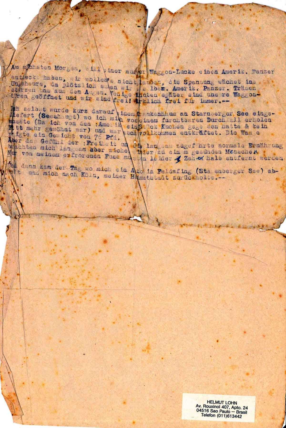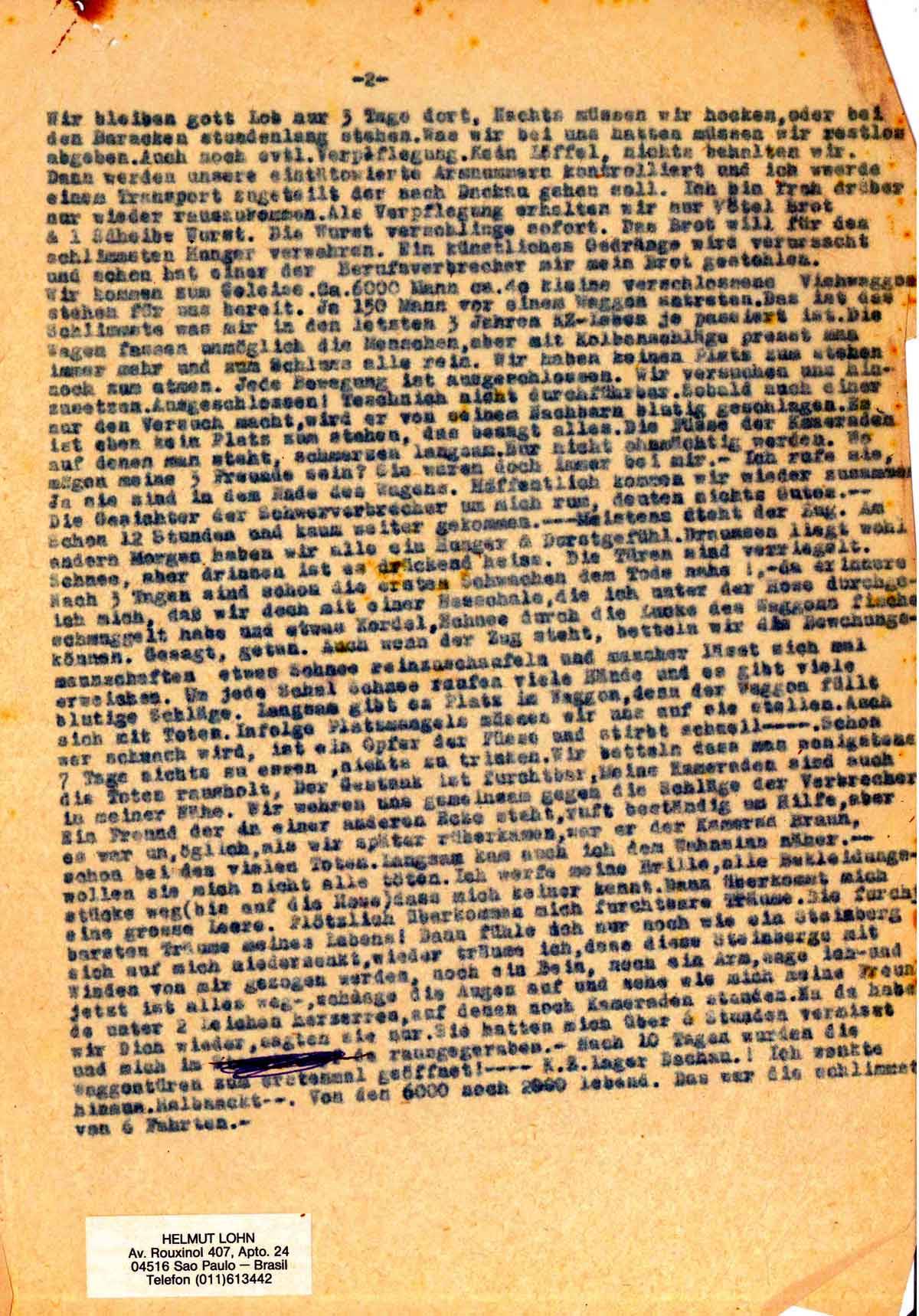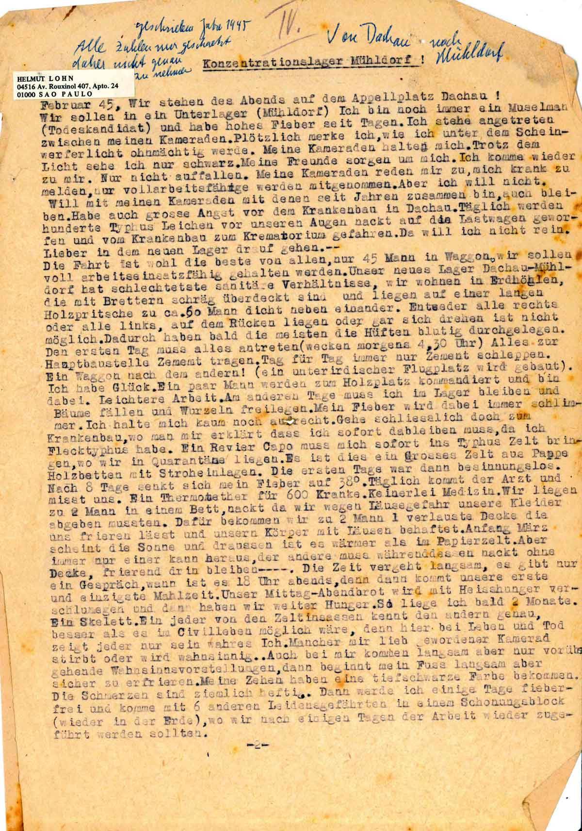Helmut Lohn, ein Kölner Jude, der zunächst nach Theresienstadt und von dort nach Auschwitz deportiert wurde, schilderte in einem im Sommer 1945 verfassten Bericht u.a. die Erfahrungen, die er während eines am 16. Januar 1945 in Auschwitz beginnenden „Todesmarsch“ machen musste, der zunächst im KZ Dachau endet. Wenig später wird Helmut Lohn mit weiteren Leidensgenossen durch amerikanische Truppen in Bayern befreit.