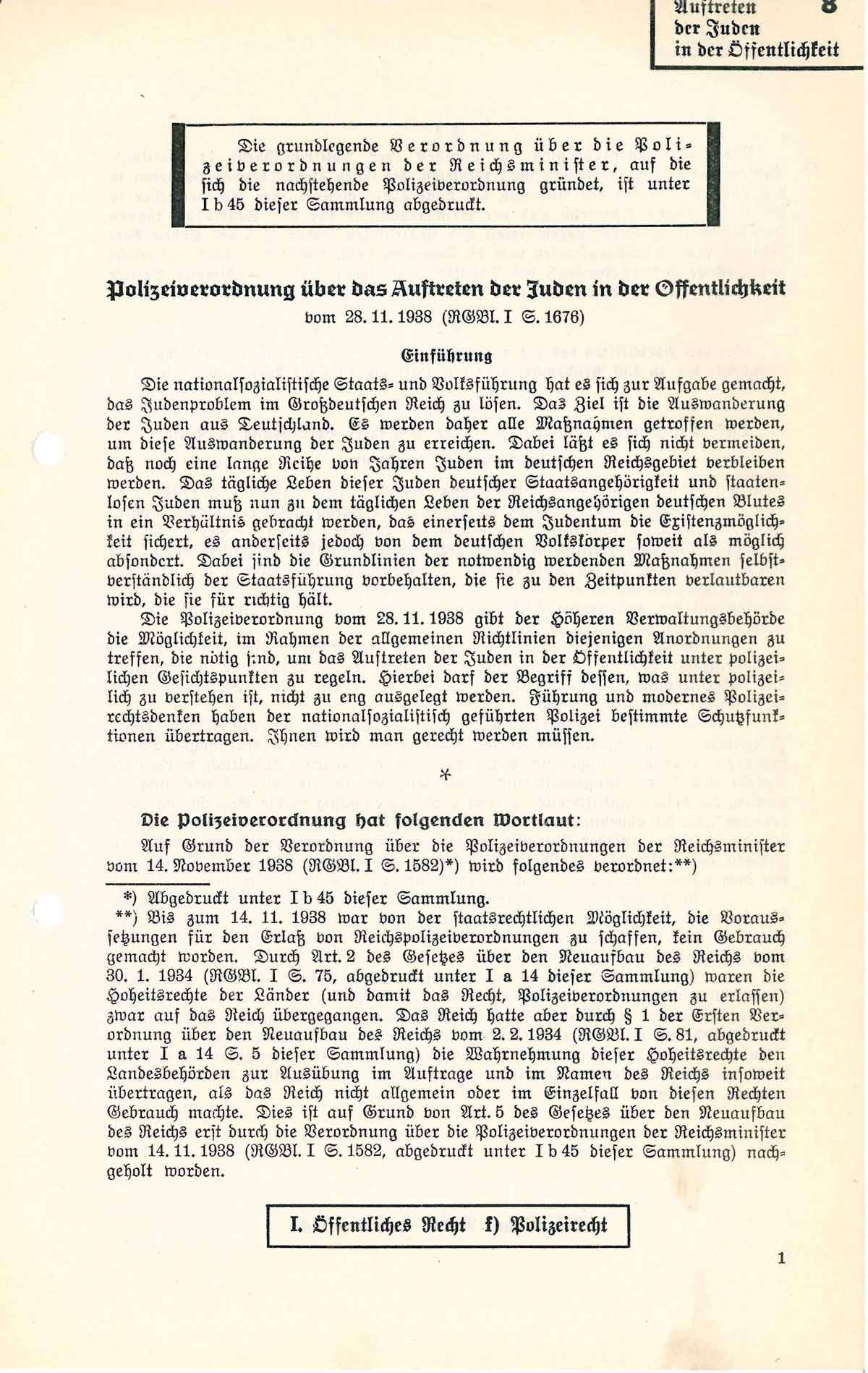 Die Polizeiverordnung vom 28.11.1938 gibt der Höheren Verwaltungsbehörde die Möglichkeit, im Rahmen der allgemeinen Richtlinien diejenigen Anordnungen zu treffen, die nötig sind, um das Auftreten der Juden in der Öffentlichkeit unter polizeilichen Gesichtspunkten zu regeln. Hierbei darf der Begriff dessen, was unter polizeilich zu verstehen ist, nicht zu eng ausgelegt werden. Führung und modernes Polizeirechtsdenken haben der nationalsozialistisch geführten Polizei bestimmte Stoßfunktionen übertragen. Ihnen wird man gerecht werden müssen.“