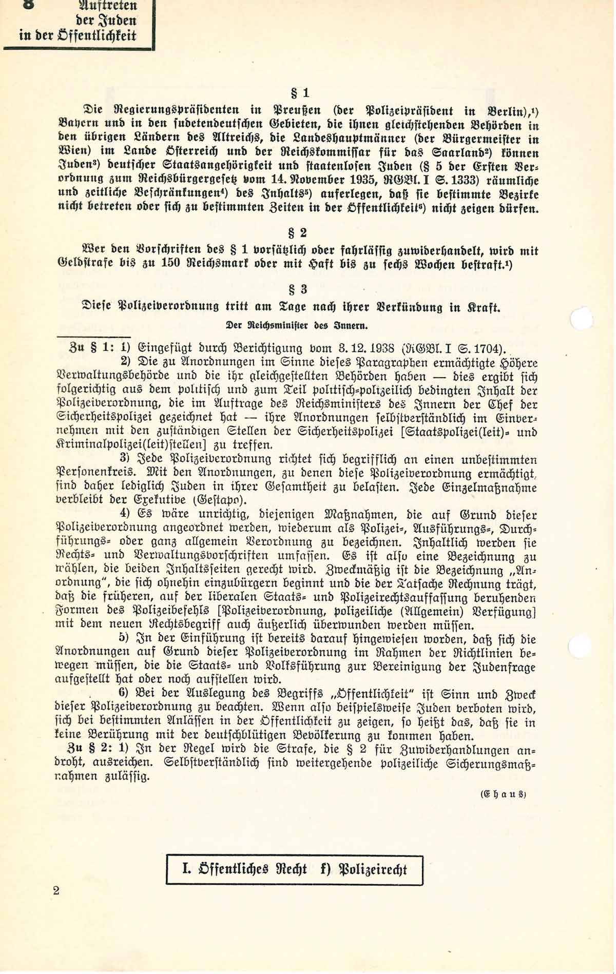 Die Regierungspräsidenten in Preußen, Bayern und die ihnen gleichstehenden Behörden in den anderen Ländern, können Juden deutscher Staatsangehörigkeit und staatenlosen Juden räumliche und zeitliche Beschränkungen des Inhalts auferlegen, dass sie bestimmte Bezirke nicht betreten oder sich zu bestimmten Zeiten in der Öffentlichkeit nicht zeigen dürfen. Zuwiderhandlungen werden bestraft.