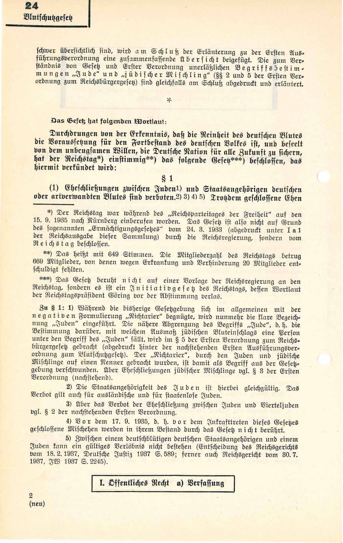 Durchdrungen von der Erkenntnis, daß die Reinheit des deutschen Blutes die Voraussetzung für den Fortbestand des Deutschen Volkes ist, und beseelt von dem unbeugsamen Willen, die Deutsche Nation für alle Zukunft zu sichern, hat der Reichstag einstimmig das folgende Gesetz beschlossen, das hiermit verkündet wird: