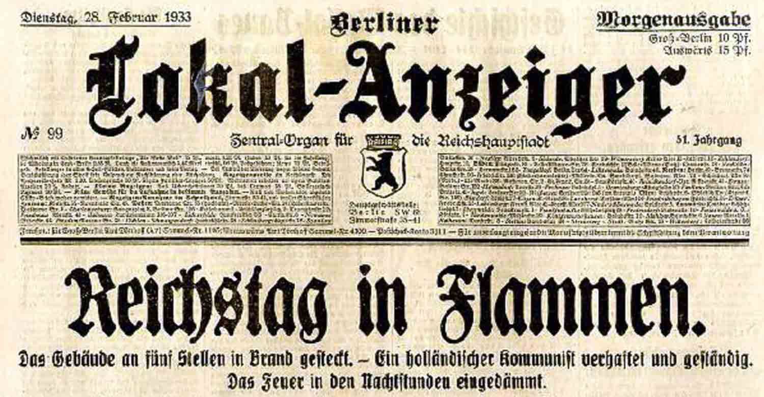 Diese die Rechtsstaatlichkeit schwer beeinträchtigenden Maßnahmen bekamen durch die Ereignisse des 27. Februar dann ein besonderes Gewicht. An diesem Tag brach gegen 21 Uhr ein Feuer im Reichstag aus, dem ein großer Teil des Gebäudes zum Opfer fiel. In der amtlichen Darstellung wurde das Geschehen propagandistisch als „Fanal zum blutigen Aufruhr und zum Bürgerkrieg“ aufgebauscht und seitens des NS-Regimes anschließend genutzt, um die Ausschaltung von Gegnern und die Abschaffung zentraler Bürgerrechte blitzartig voranzutreiben. Noch am Brandort selbst verbreitete Göring als offizielle Version, die KPD sei für die Brandstiftung verantwortlich, woraufhin allein in Berlin bis zum nächsten Morgen 130 Personen verhaftet und mehrere Razzien in Arbeitervierteln durchgeführt wurden.