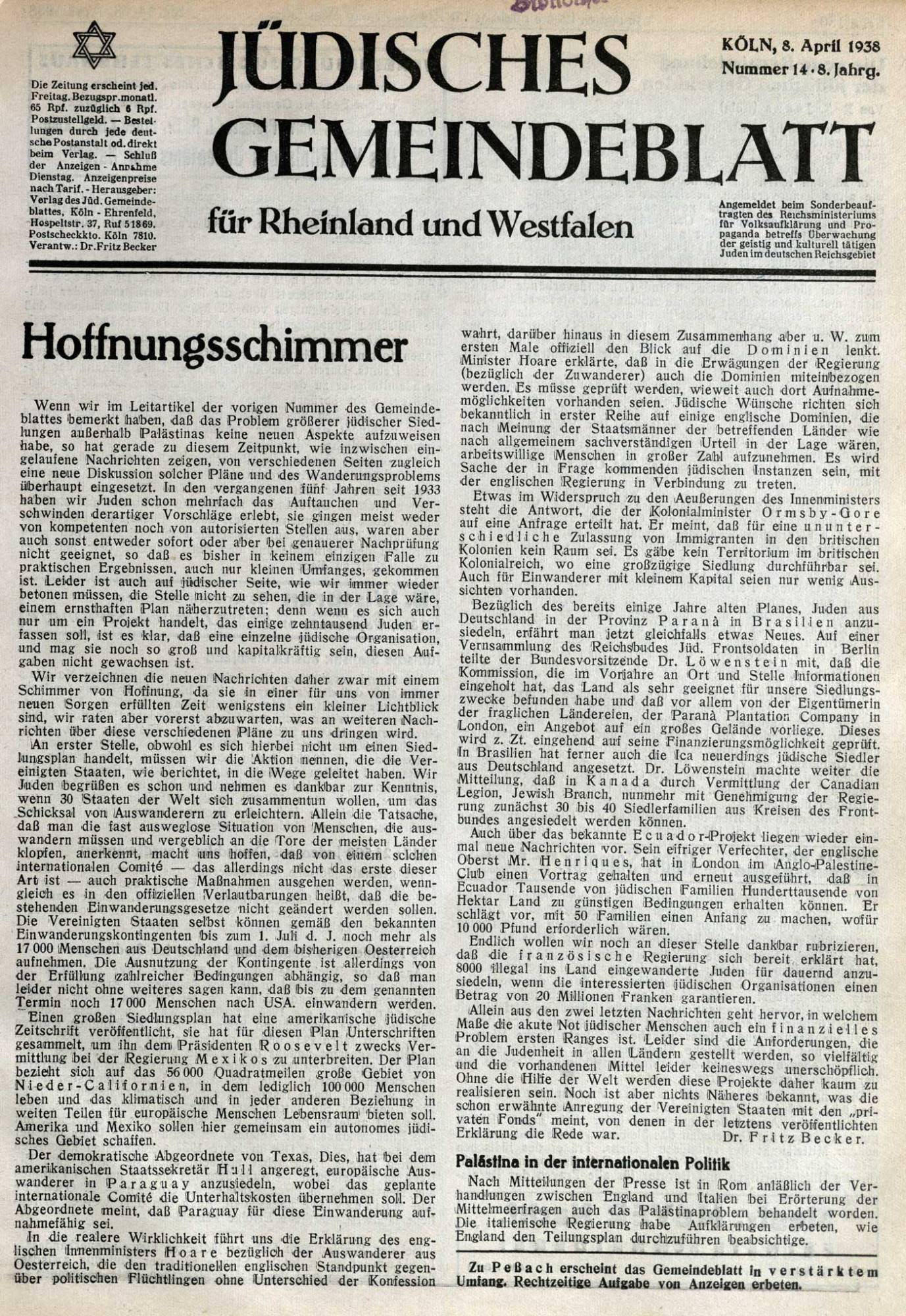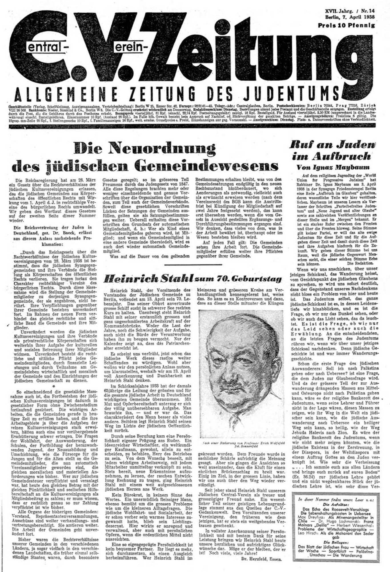 Die jüdischen Gemeinde und ihre Mitglieder hatten mit dem Beginn des Monats einen herben Schlag zu verkraften. Mit dem am 28. März 1938 erlassenen „Gesetz zur Änderung der Rechtsverhältnisse der jüdischen Kultusgemeinden“ verloren sie mit Wirkung vom 1. April 1938 an den Status einer Körperschaft öffentlichen Rechts, was gravierende finanzielle Auswirkungen nach sich zog, weil die Gemeinden künftig auf ihr Eigentum – etwa Synagogen, Friedhöfe und karitative Einrichtungen - Steuern zahlen mussten. Die damit einhergehende finanzielle Belastung wurde noch dadurch erhöht, dass die Gemeindeeinnahmen aufgrund der zunehmenden der Verarmung ihrer Mitglieder stark rückläufig waren, während sich zugleich die Ausgaben für Sozialfürsorge wegen der Ausgrenzung der jüdischen Bevölkerung aus der allgemeinen Fürsorge massiv und permanent erhöhten. Dieses Gesetz stellte den Auftakt zu einem inneren organisatorischen Umwandlungsprozess der gesamten jüdischen Selbstverwaltung im Reichsgebiet dar, der im Juli des Jahres mit der Gründung des „Reichsverbandes der Juden in Deutschland“ seine Fortsetzung finden und mit der Gründung der „Reichsvereinigung der Juden in Deutschland“ im Februar 1939 enden sollte.