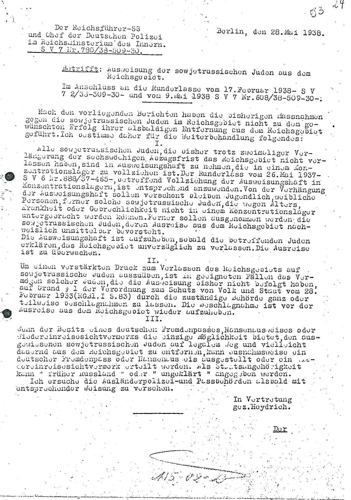 Anordnung des Reichsführers-SS und Chef der Deutschen Polizei betrifft „Ausweisung der sowjetrussischen Juden aus dem Reichsgebiet“ vom 28. Mai 1938