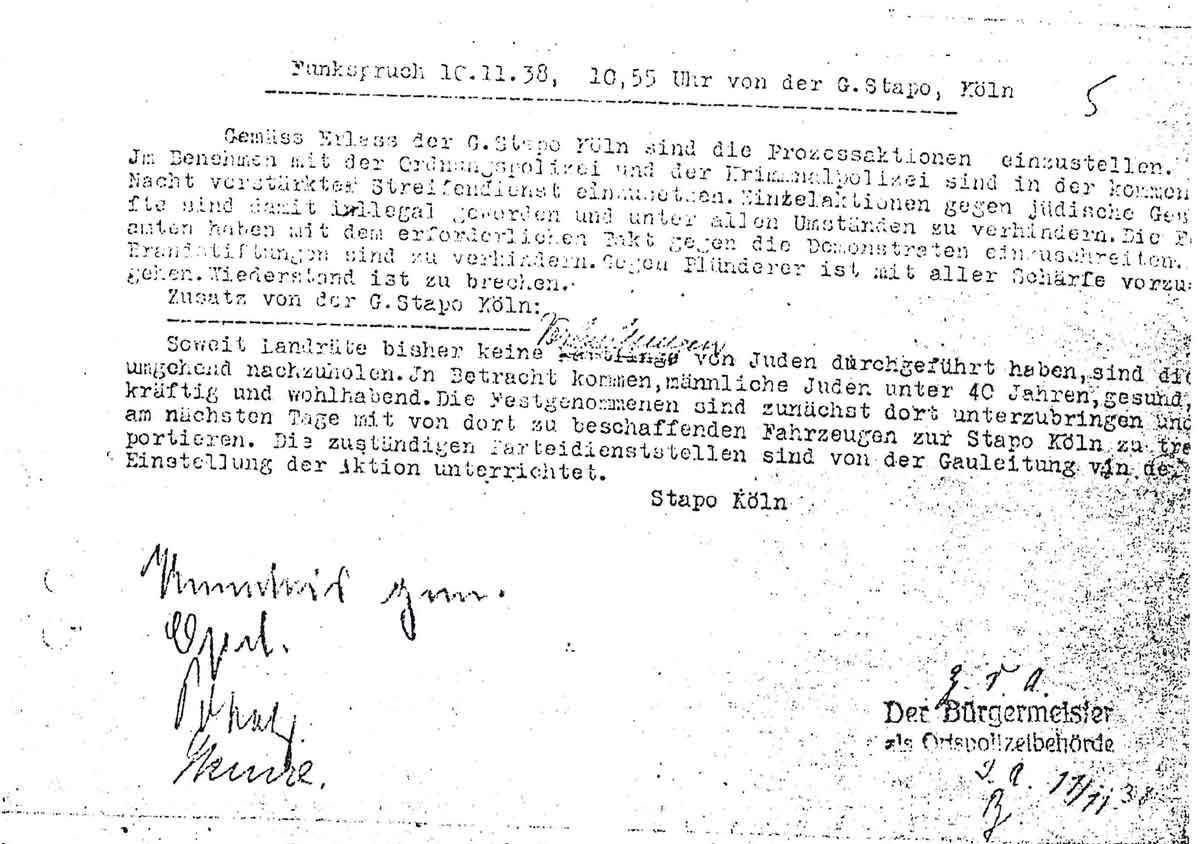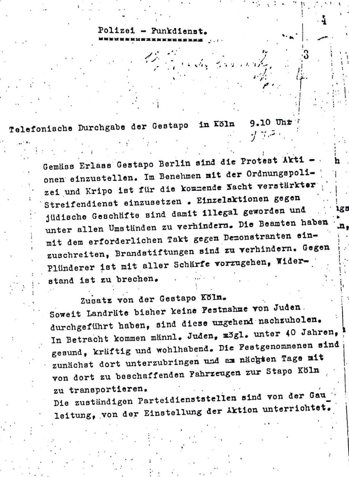 „Gemäss Erlass der G.Stapo Köln sind die Prozessaktionen einzustellen. Im Benehmen mit der Ordnungspolizei und der Kriminalpolizei sind in der kommenden Nacht verstärkter Streifendienst einzusetzen. Einzelaktionen gegen jüdische Geschäfte sind damit illegal geworden und unter allen Umständen zu verhindern. Die Beamten haben mit dem erforderlichen Fakt gegen die Demonstranten einzuschreiten. Brandstiftungen sind zu verhindern. Gegen Plünderer ist mit aller Schärfe vorzugehen. Widerstand ist zu brechen.“