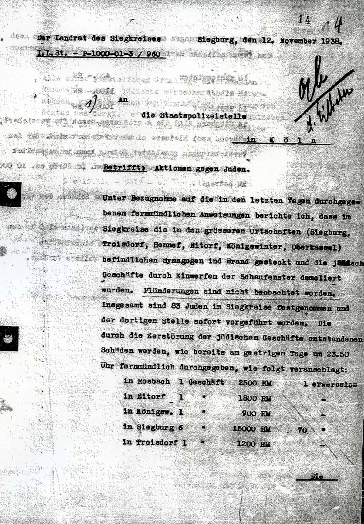 Insgesamt sind 83 Juden im Siegkreise festgenommen und der dortigen Stelle sofort vorgeführt worden. Die durch die Zerstörung der jüdischen Geschäfte entstandenen Schäden werden, wie bereits am gestrigen Tage um 23.50 Uhr fernmündlich durchgegeben, wie folgt veranschlagt: