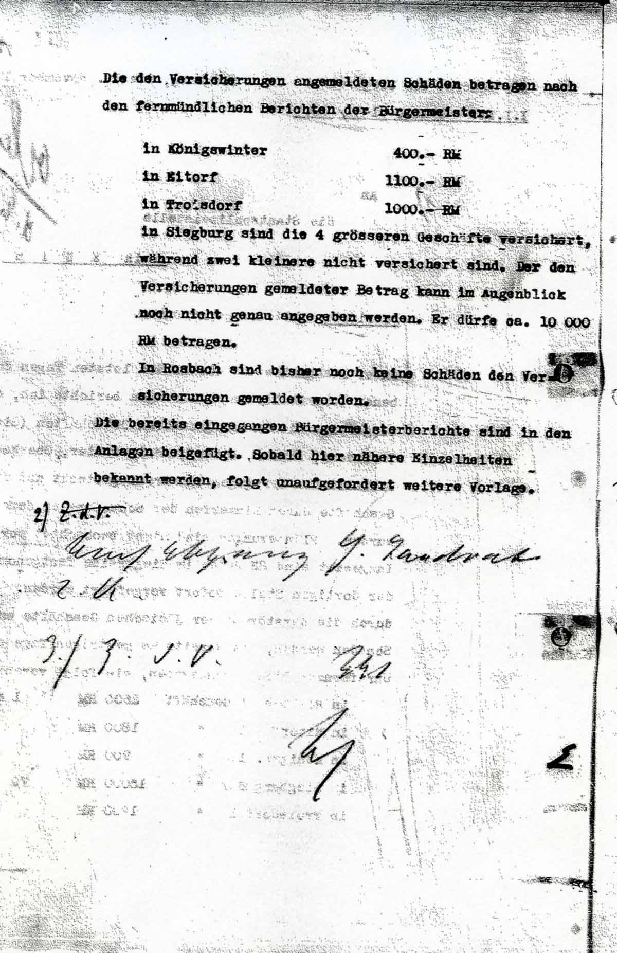 „Unter Bezugnahme auf die in den letzten Tagen durchgegebenen fernmündlichen Anweisungen berichte ich, dass im Siegkreis die in den größeren Ortschaften (Siegburg, Troisdorf, Hennef, Eitorf, Königswinter, Oberkassel) befindlichen Synagogen in Brand gesteckt und die jüdischen Geschäfte durch Einwerfen der Schaufenster demoliert wurden, Plünderungen sind nicht beobachtet worden.