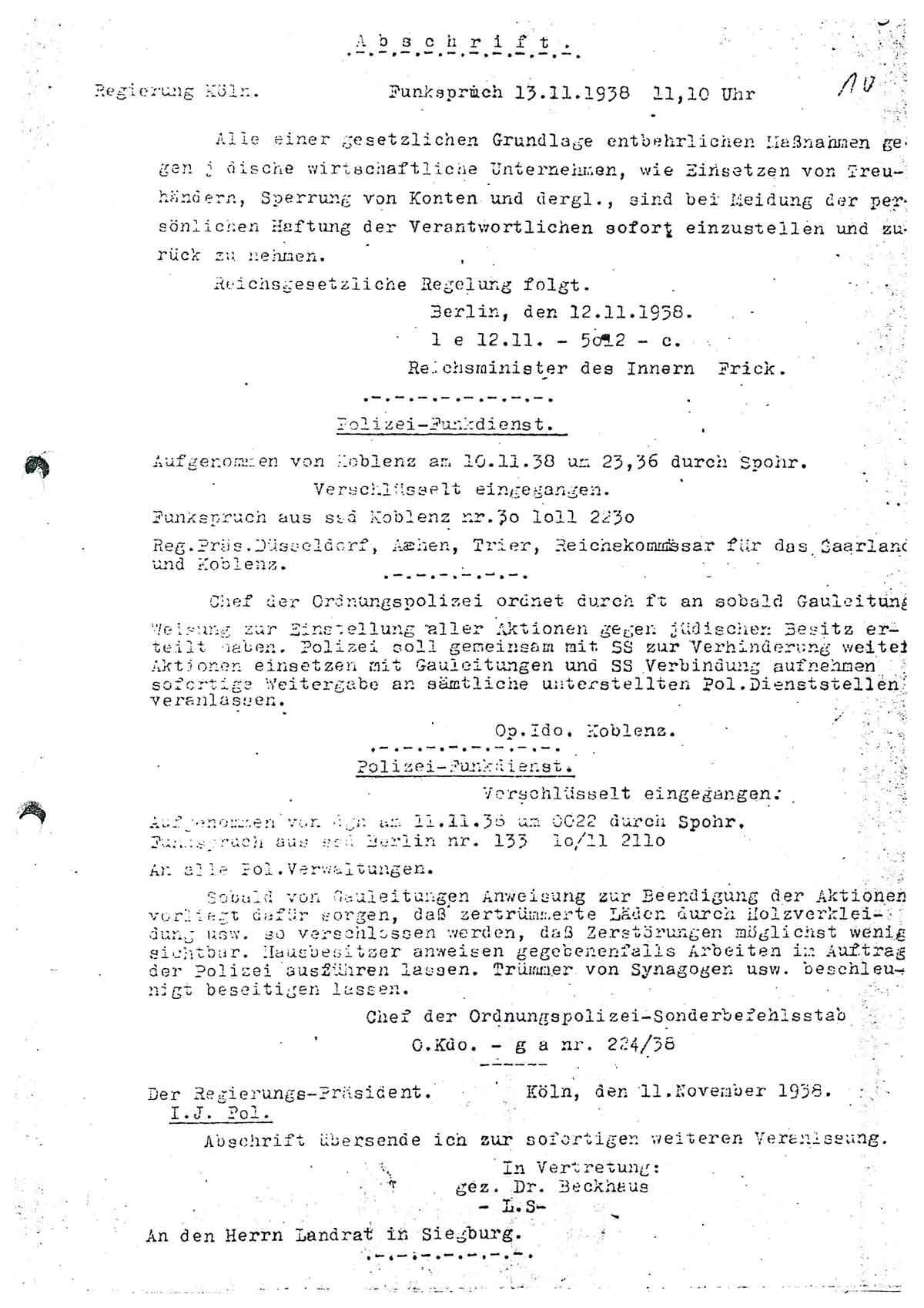 Am Vormittag des 13. November 1938 traf im Regierungspräsidium Köln folgender, auf einem Erlass des Reichsinnenministeriums vom Vortag basierender Funkspruch ein: