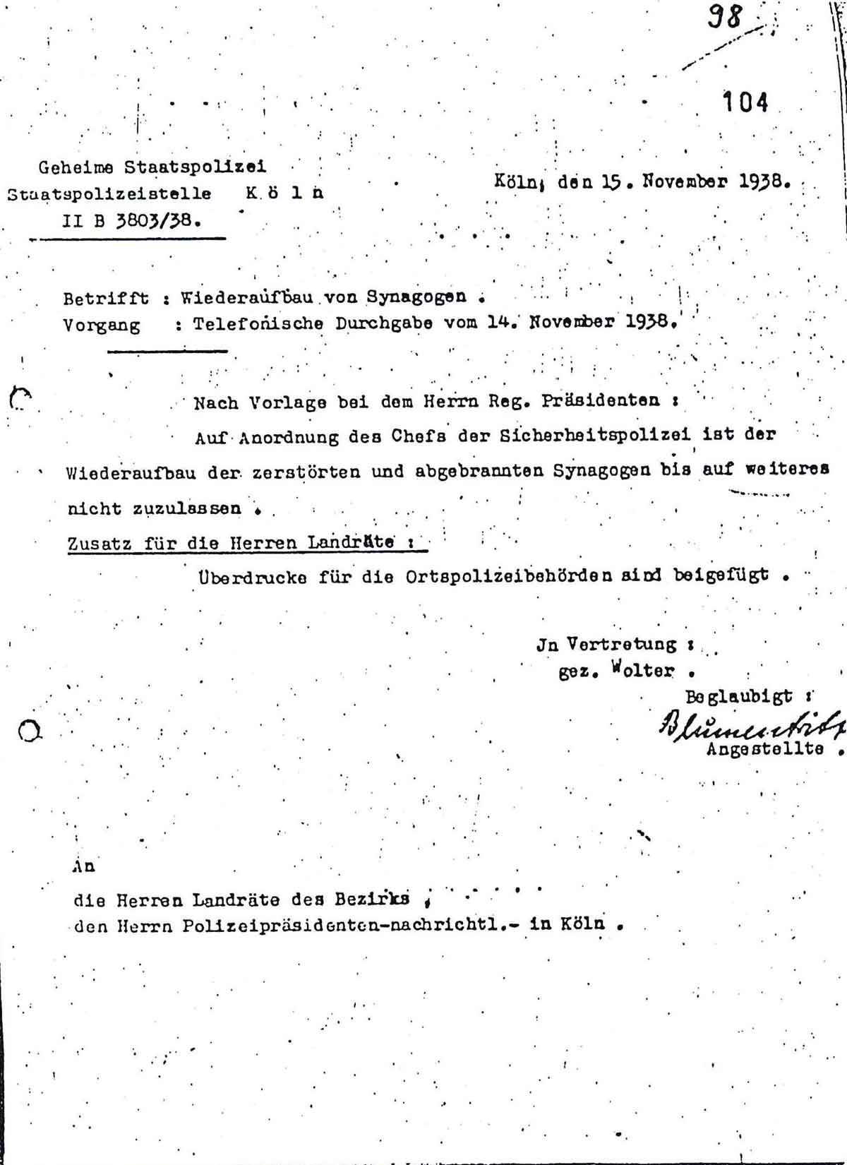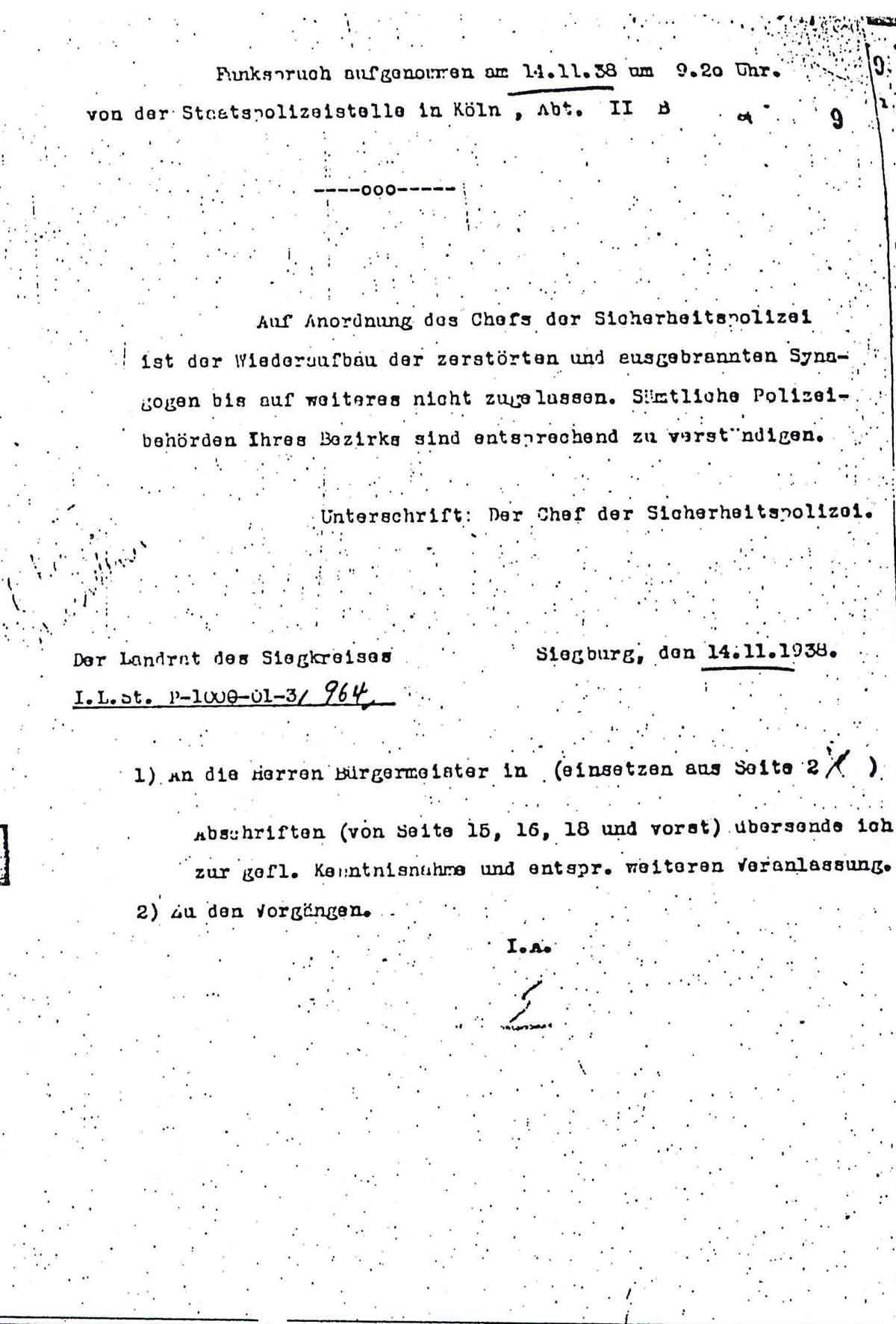 „Auf Anordnung des Chefs der Sicherheitspolizei ist der Wiederaufbau der zerstörten und ausgebrannten Synagogen bis auf weiteres nicht zugelassen. Sämtliche Polizeibehörden Ihres Bezirkes sind entsprechend zu verständigen.“