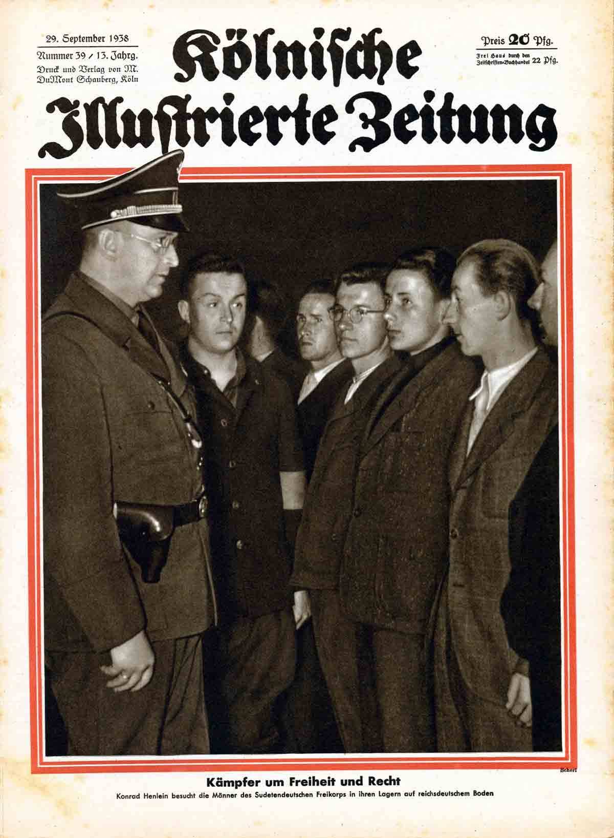 Angesichts der alarmierenden Ereignisse trafen der britische Premierminister Neville Chamberlain und Adolf Hitler am 15. in Berchtesgaden zusammen, wo sie rund zweieinhalb Stunden über die Lösung der Sudetenfrage konferierten, während Konrad Henlein als der Führer der SdP am gleichen Tag über den Wiener Rundfunk zum Anschluss des Sudetenlands an das Deutsche Reich aufrief. Wiederum einen Tag später erklärte die tschechoslowakische Regierung daraufhin die SdP und ihre Ordnerorganisation Freiwilliger Selbstschutz (FS) für aufgelöst. Der - ebenso wie die anderen führenden Persönlichkeiten der SdP - ins Deutsche Reich geflohene Henlein wurde nun polizeilich gesucht, was ihn aber nicht davon abhielt, am 17. September auf deutschem Boden mit der Aufstellung eines bis zu 15.000 Mann starken Sudetendeutschen Freikorps zu beginnen, was ihm umso leichter fiel, als allein bis zum 19. September nach offiziellen deutschen Angaben bereits 102.000 Sudetendeutsche die Reichsgrenze überschritten haben sollten.
