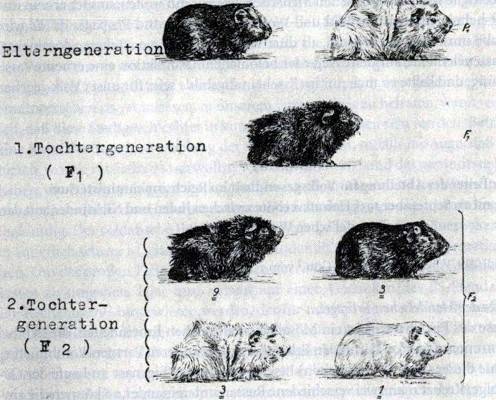 Das beigegebene Schaubild zeigt den Erbgang bei der Vermischung zweier Eigenschaftspaare (schwarz-weiß; glatthaarig-rauhhaarig); da schwarz gegen weiß durchschlagend ist und ebenso rauhhaarig gegenüber glatthaarig ergeben sich in der ersten Tochtergeneration (F 1) nur schwarze rauhhaarige Tiere. Diese unter sich gekreuzt, ergeben als zweite Tochtergeneration verschiedenartige Tiere, nämlich 9 schwarze rauhhaarige, 3 schwarze glatthaarige, 3 weiße rauhhaarige und 1 weißes glattes. Dieses letztere Tier ist reinrassig, da es nur die verdeckbaren Eigenschaften zeigt. Außerdem muß von den 9 schwarzen rauhhaarigen je ein Tier reinrassig sein, während der Rest dieser Tiere auch Anlagen zu den verdeckbaren Eigenschaften in der Erbmasse enthält, die nur durch die von ihnen gezeigten durchschlagenden Eigenschaften verdeckt sind.