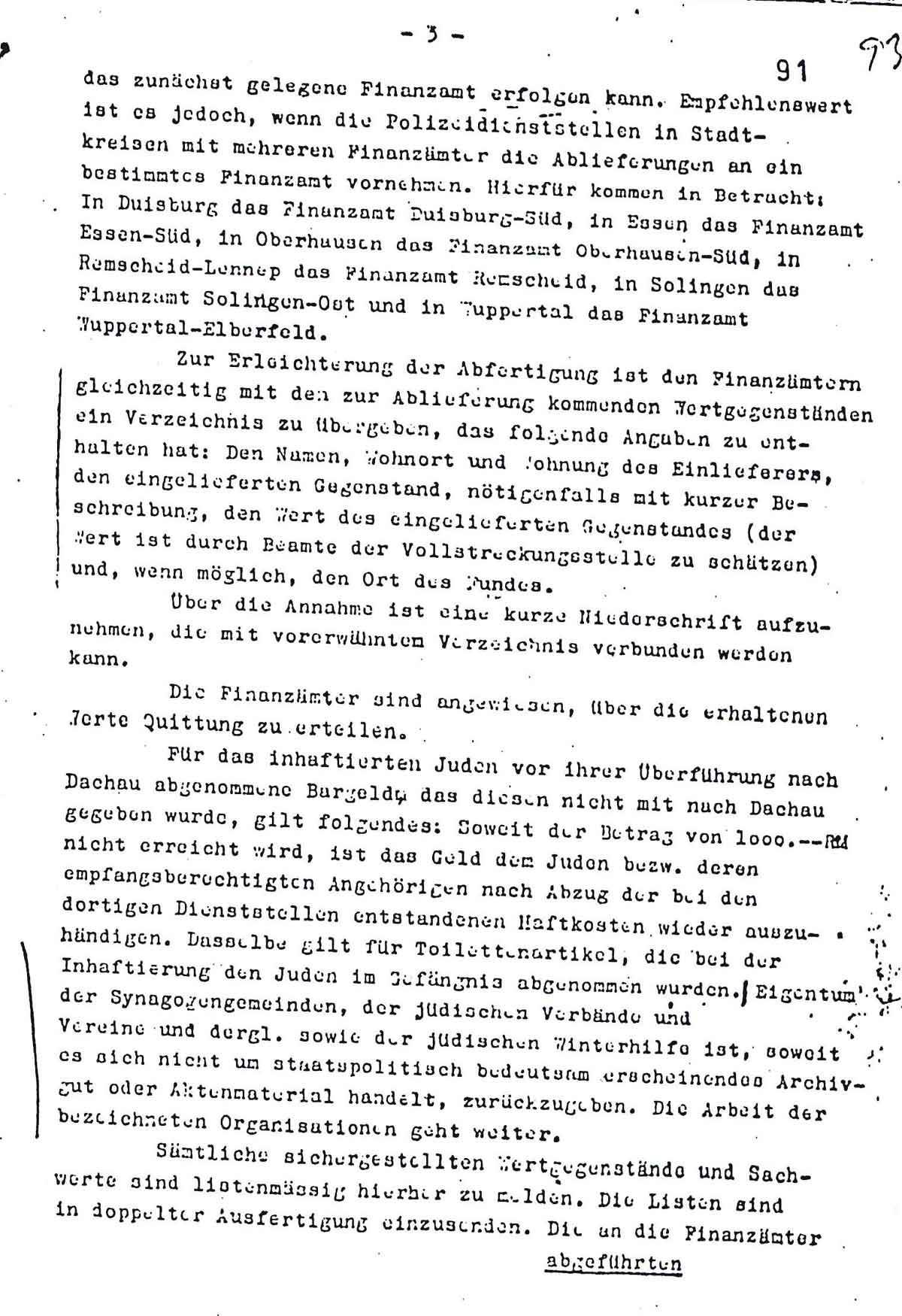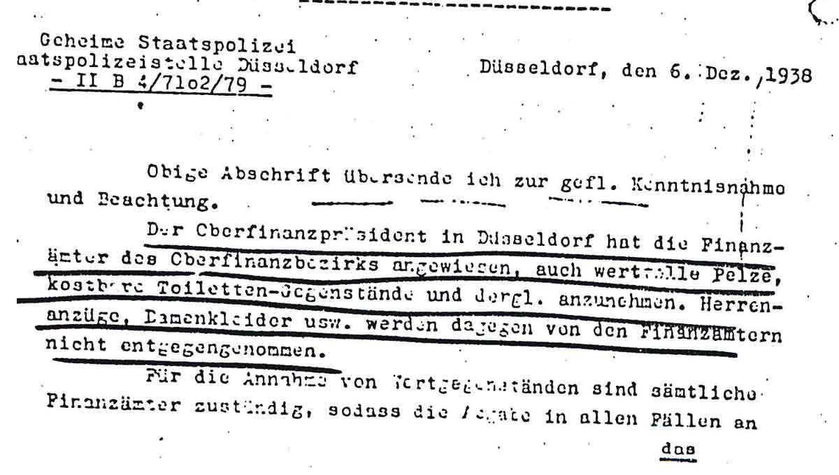 Der Düsseldorfer Oberfinanzpräsident weist die ihm unterstellten Finanzämter am 6. Dezember 1938 an, „wertvolle Pelze, kostbare Toiletten-Gegenstände und dergl. anzunehmen“, „Herrenanzüge, Damenkleider usw.“ hingegen abzulehnen. Hierzu erteilt er ebenso ausführliche und detaillierte Anweisungen wie zum Umgang mit dem Bargeld, das den nach dem Pogrom in Dachau inhaftierten Juden abgenommen worden war.
