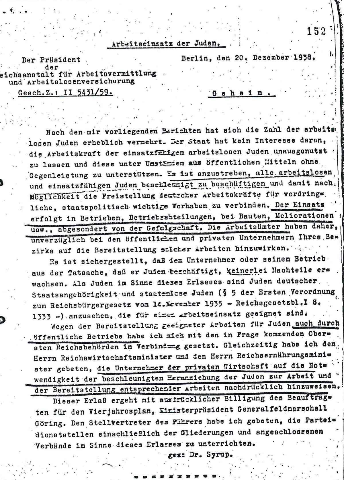 Der Präsident der Reichsanstalt für Arbeitsvermittlung teilt am 20. Dezember 1938 in einem geheimen Rundschreiben mit: