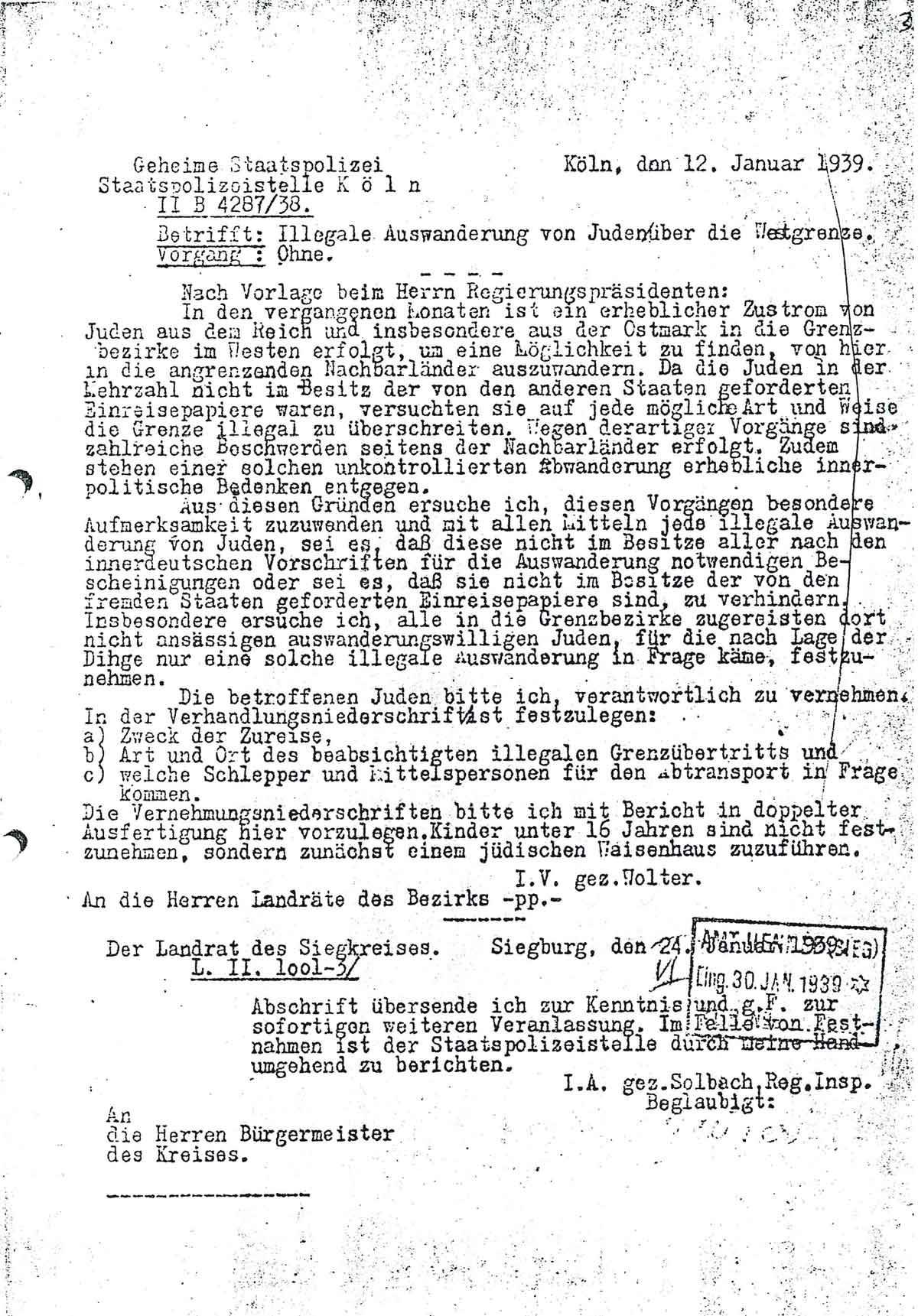 Am 12. Januar 1939 teilt die Gestapostelle Köln den Landräten im Regierungsbezirk Folgendes mit: