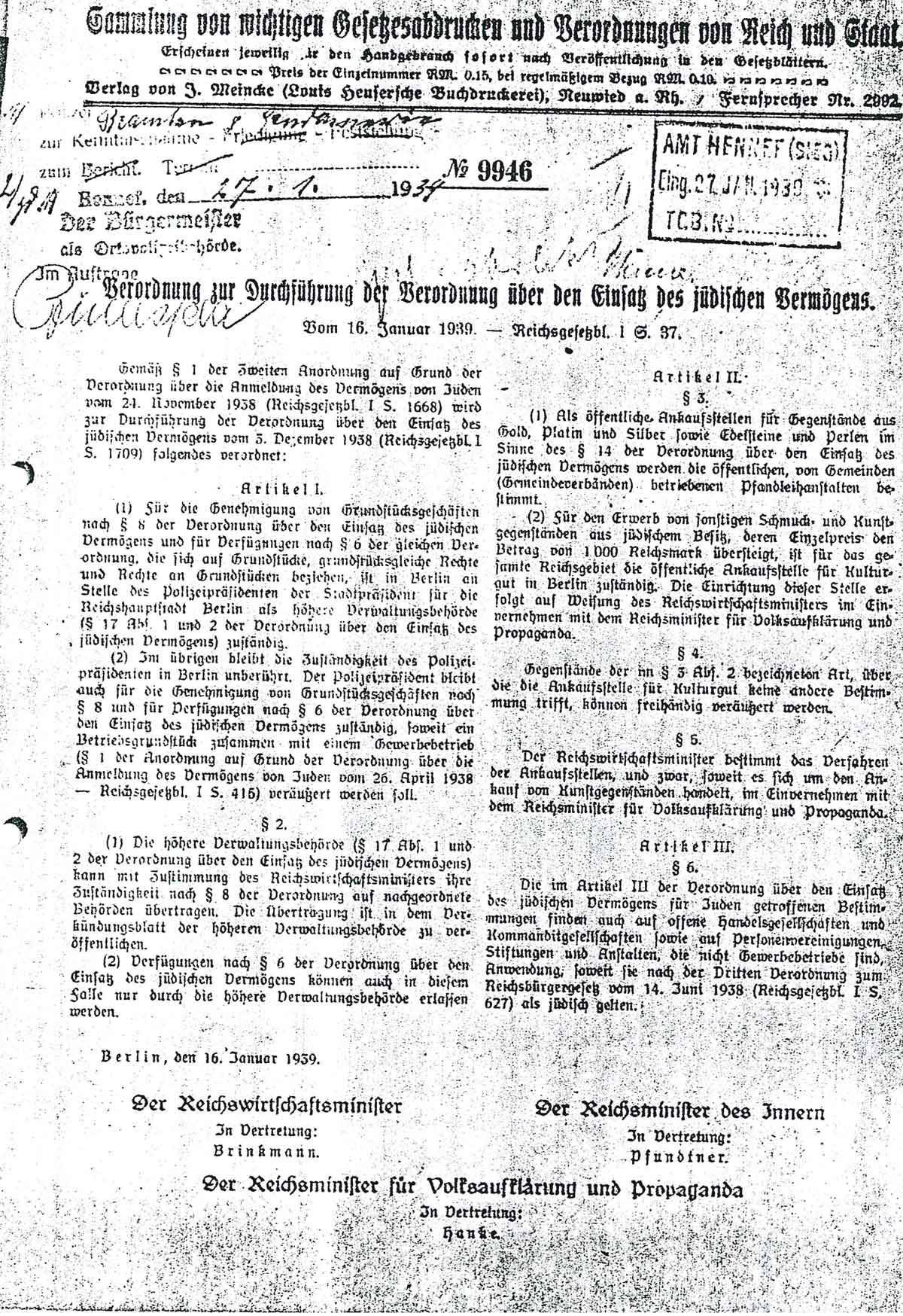Am 16. Januar 1939 erlassen Reichswirtschafts- und Reichsinnenminister folgende Verordnung: