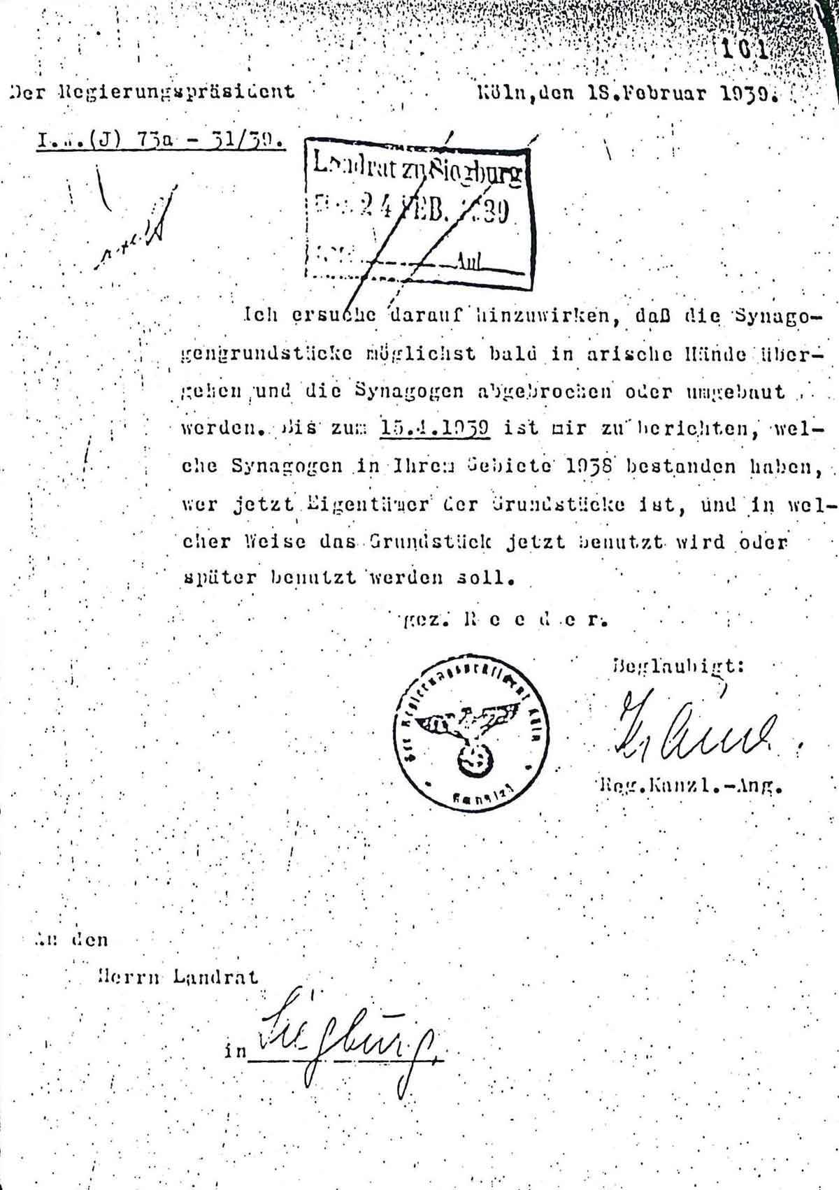 Am 18. Februar 1939 ordnet der Kölner Regierungspräsident hinsichtlich der Synagogengrundstücke Folgendes an: