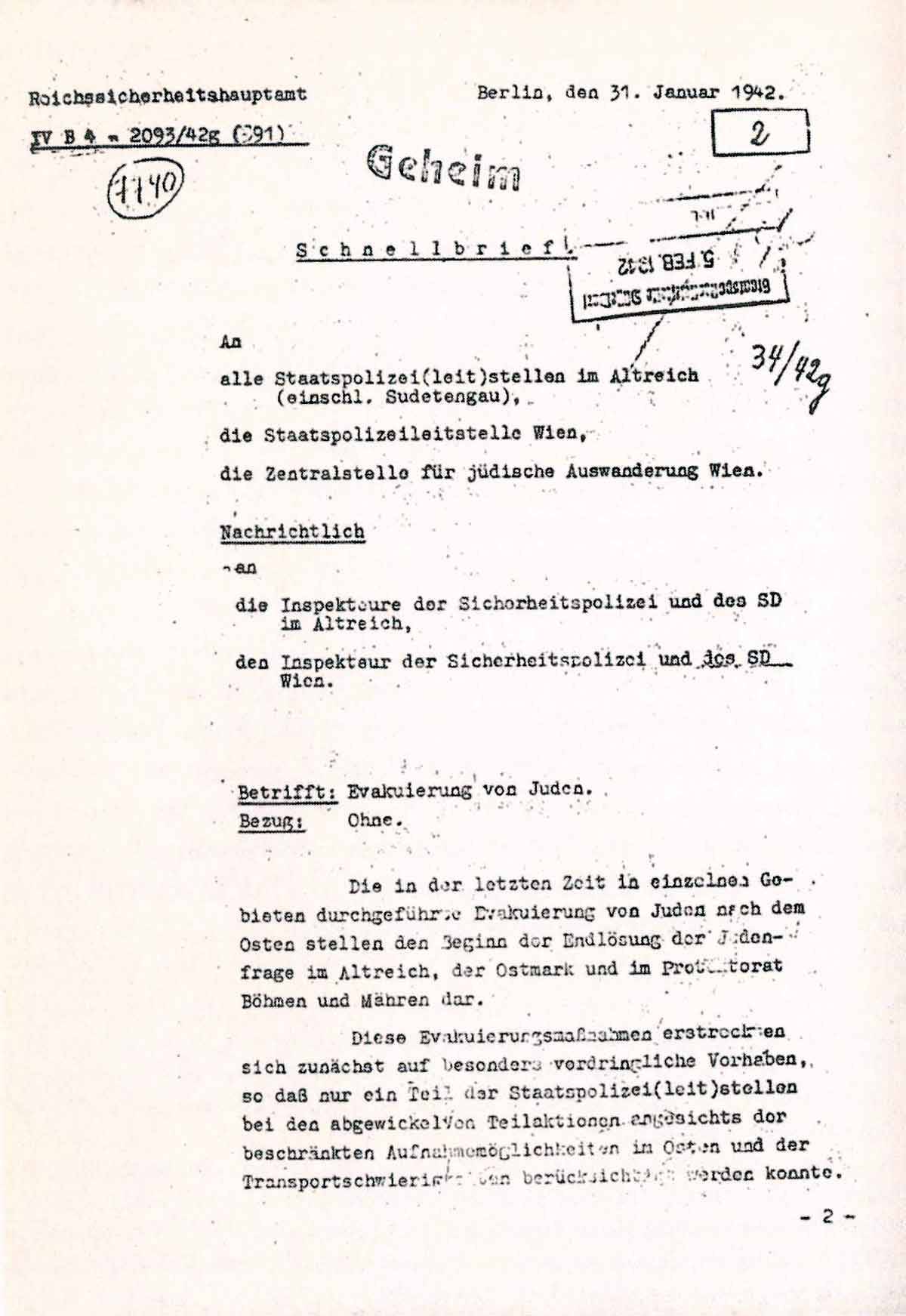 Die in der letzten Zeit in einzelnen Gebieten durchgeführte Evakuierung von Juden nach dem Osten stellt den Beginn der Endlösung der Judenfrage im Altreich, [in] der Ostmark und im Protektorat Böhmen und Mähren dar.