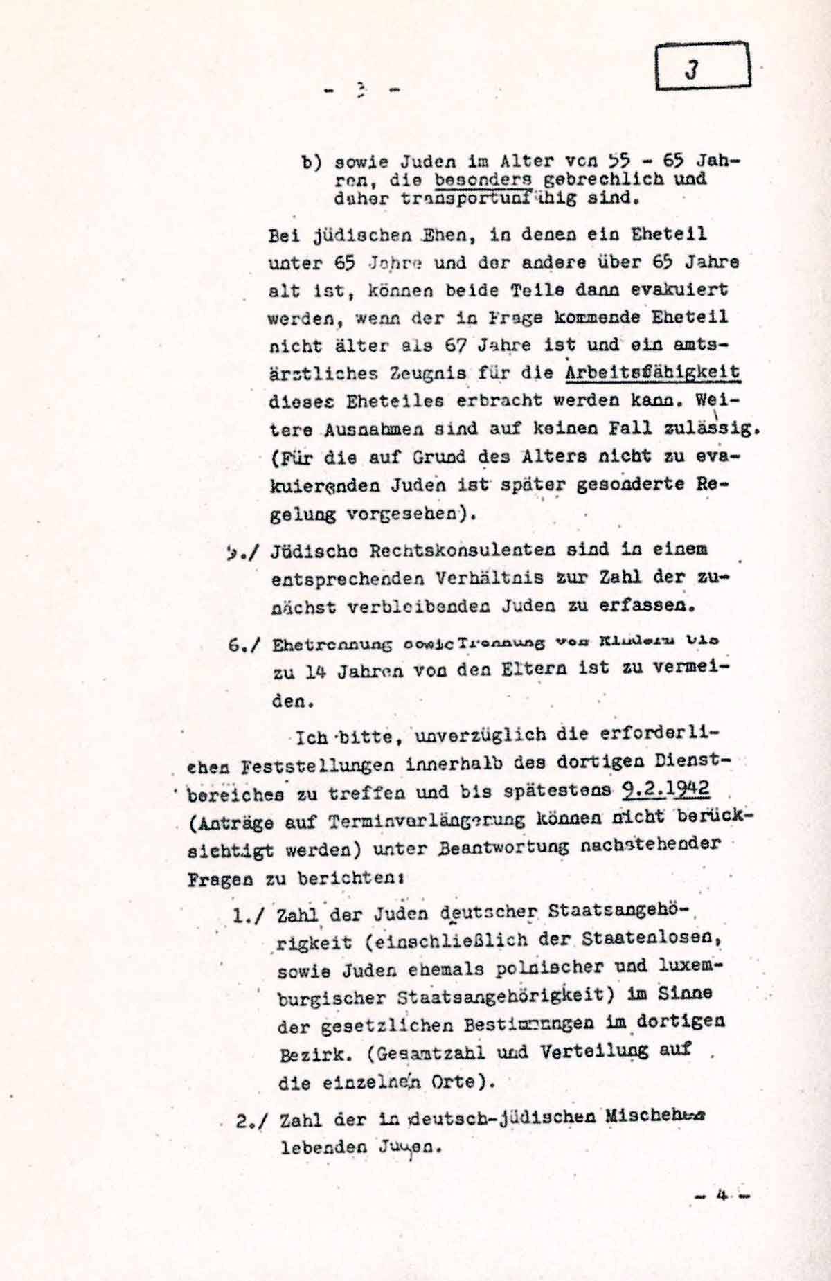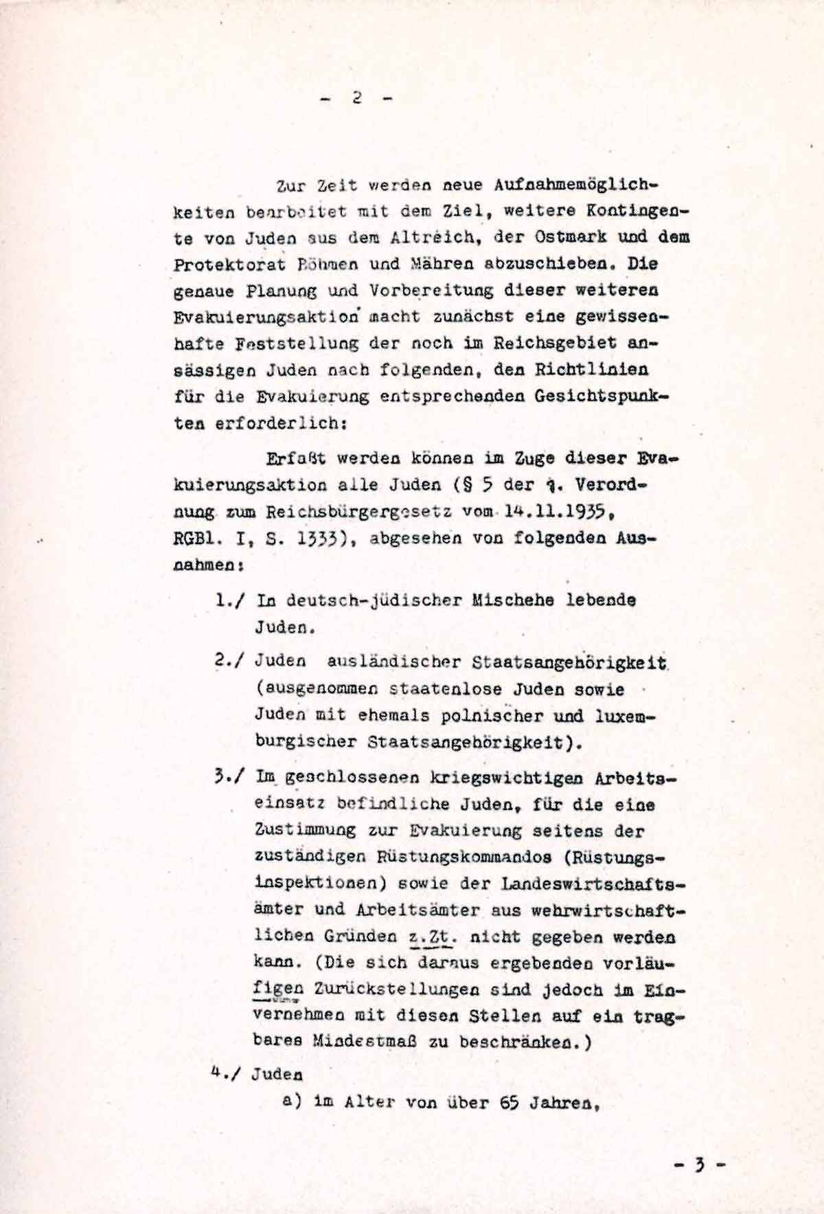 Bei jüdischen Ehen, in denen ein Eheteil unter 65 Jahre und der andere über 65 Jahre alt ist, können beide Teile dann evakuiert werden, wenn der in Frage kommende Eheteil nicht älter als 67 Jahre ist und ein amtsärztliches Zeugnis für die Arbeitsfähigkeit dieses Eheteils erbracht werden kann. Weitere Ausnahmen sind auf keinen Fall zulässig. (Für die auf Grund des Alters nicht zu evakuierenden Juden ist später gesonderte Regelung vorgesehen).