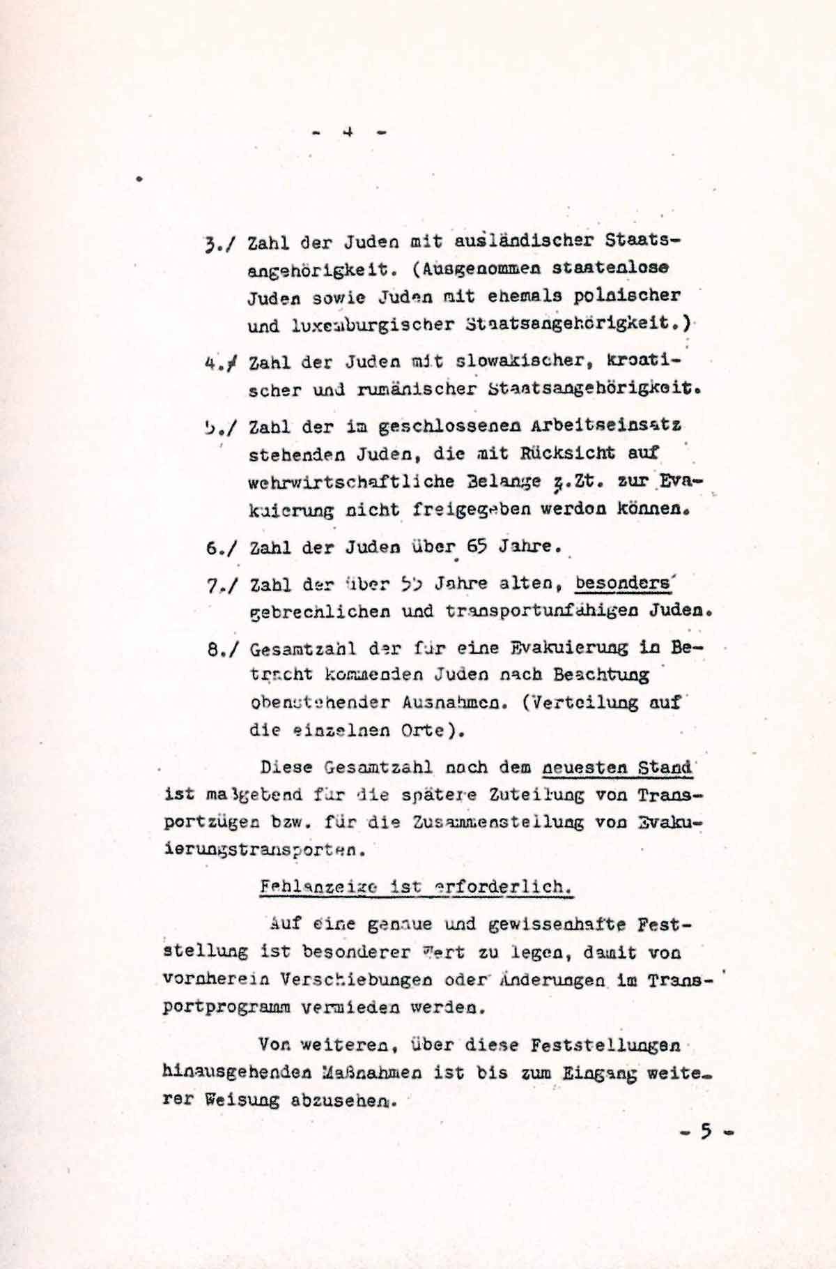 Zur Zeit werden neue Aufnahmemöglichkeiten bearbeitet mit dem Ziel, weitere Kontingente von Juden aus dem Altreich, der Ostmark und dem Protektorat Böhmen und Mähren abzuschieben. Die genaue Planung und Vorbereitung dieser weiteren Evakuierungsaktionen macht zunächst eine gewissenhafte Feststellung der noch im Reichsgebiet ansässigen Juden nach folgenden, den Richtlinien für die Evakuierung entsprechenden Gesichtspunkten erforderlich: