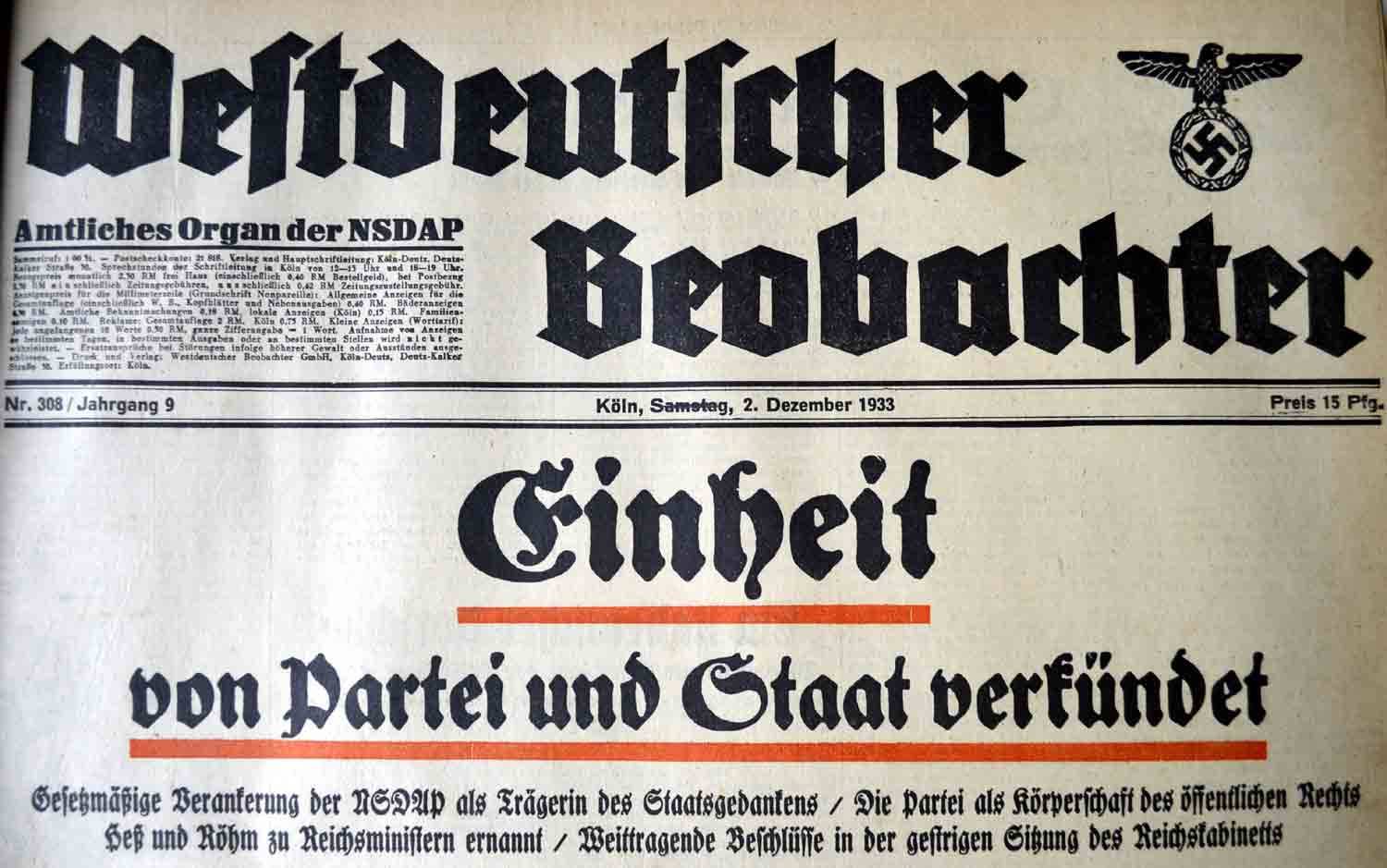 Durch das „Gesetz zur Sicherung der Einheit von Partei und Staat“ wurde die NSDAP am 1. Dezember zur Körperschaft öffentlich Rechts erklärt, wodurch deren Mitgliedern zugleich ein erhöhter Rechtsstatus eingeräumt wurde. Im einleitenden Passus des Gesetz heißt es: „Nach dem Sieg der nationalsozialistischen Revolution ist die Nationalsozialistische Arbeiterpartei die Trägerin des deutschen Staatsgedankens und mit dem Staat unlöslich verbunden.“ Aufgrund dieser „Staatswerdung“ einer Partei wurden deren stellvertretender Führer Rudolf Heß und SA-Stabschef Ernst Röhm als Minister ohne Geschäftsbereich zugleich zu Mitgliedern der Reichsregierung. So sollte die „engste Zusammenarbeit“ von NSDAP und SA mit den staatlichen Behörden sichergestellt werden. Dass der Reichstag keinerlei Rolle mehr spielen würde, verdeutlichte dessen konstituierender Sitzung in der Kroll-Oper am 12. Dezember, wo sich die 661 Abgeordneten der NSDAP zu einer ganze sieben Minuten dauernden Sitzung zusammenfanden. Künftig sollte der Reichstag nur noch zu besonderen innen- oder außenpolitischen Anlässen zusammenkommen.