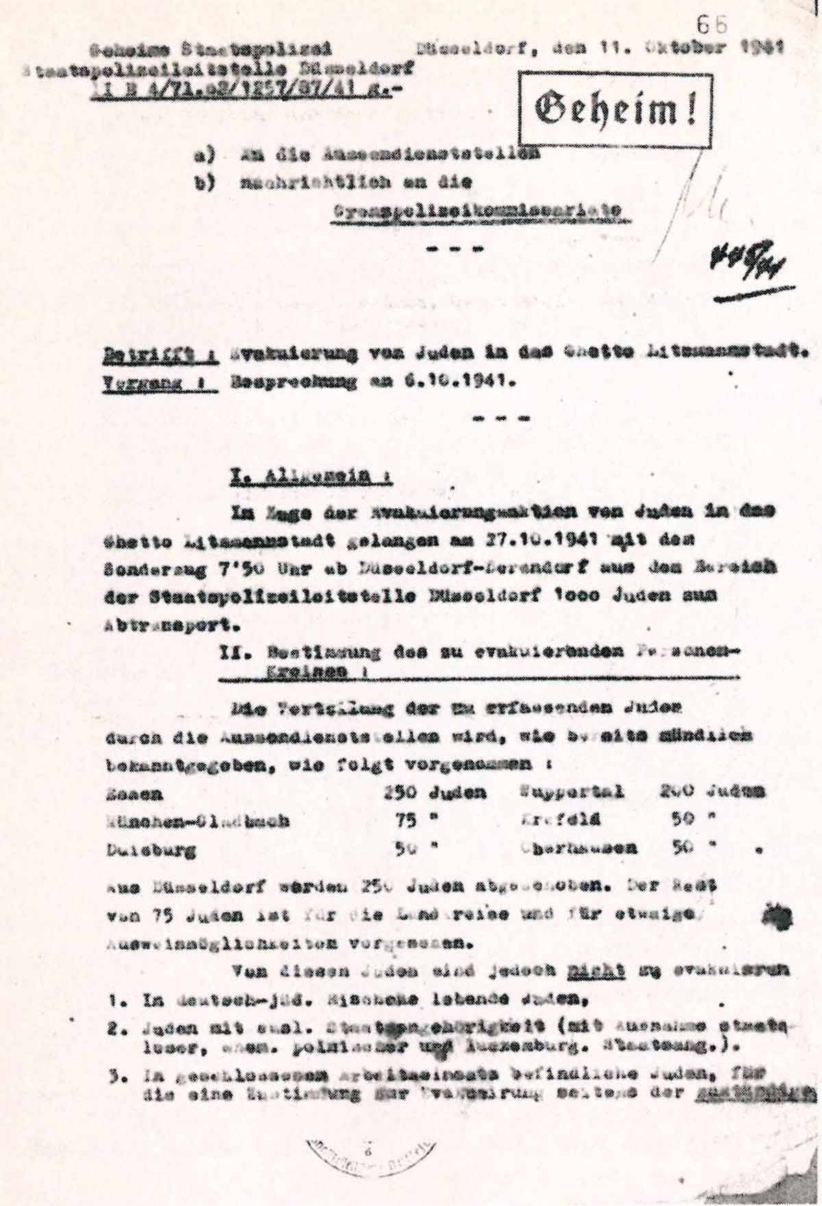 Am 11. Oktober 1941 ließ die Staatspolizeileitstelle Düsseldorf ihren Außendienststellen folgenden Geheimerlass mit den Grundsätzen zur "Evakuierung von Juden in das Ghetto Litzmannstadt" zugehen: