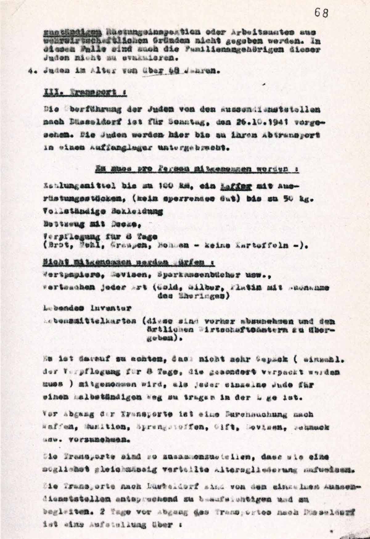 Die Überführung der Juden von den Aussendienststellen nach Düsseldorf ist für Sonntag, den 26.10.1941 vorgesehen. Die Juden werden hier bis zu ihrem Abtransport in einem Auffanglager untergebracht.