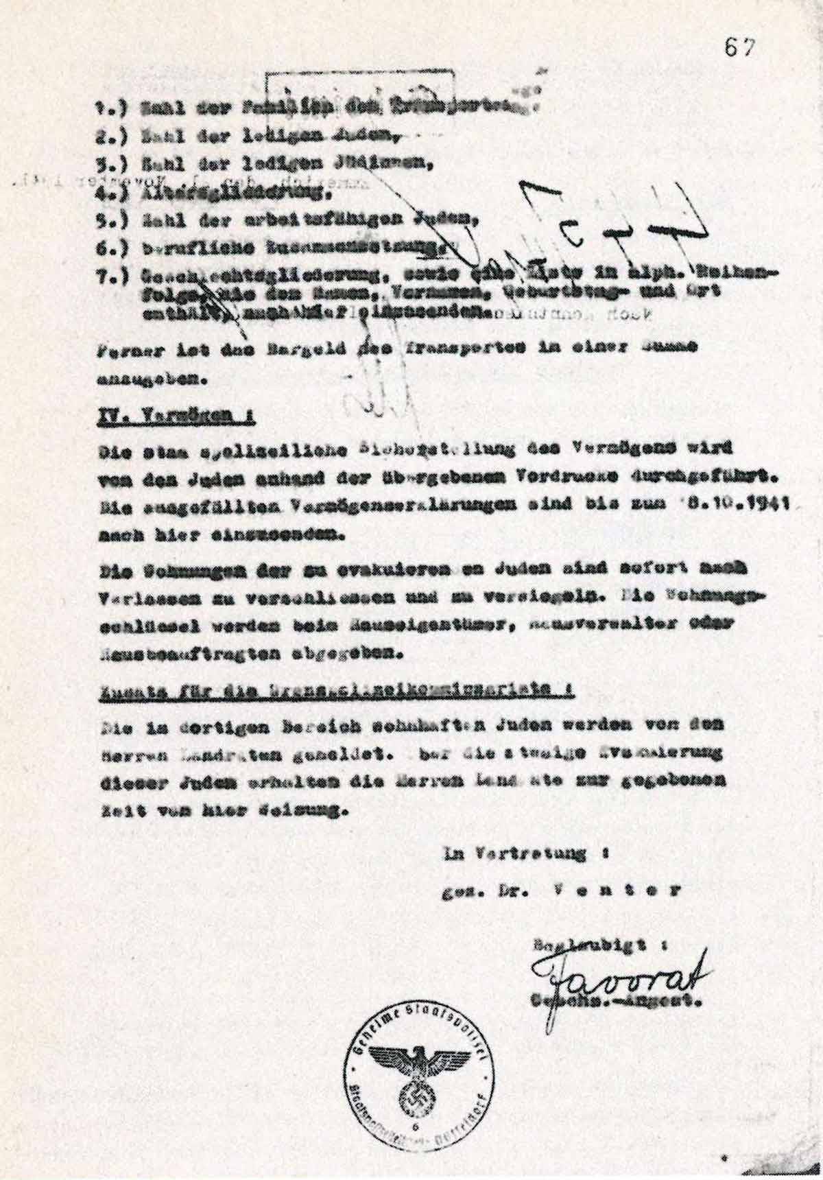 Die staatspolizeiliche Sicherstellung des Vermögens wird von den Juden anhand der übergebenen Vordrucke durchgeführt. Die ausgefüllten Vermögenserklärungen sind bis zum 18.10.1941 nach hier einzusenden.