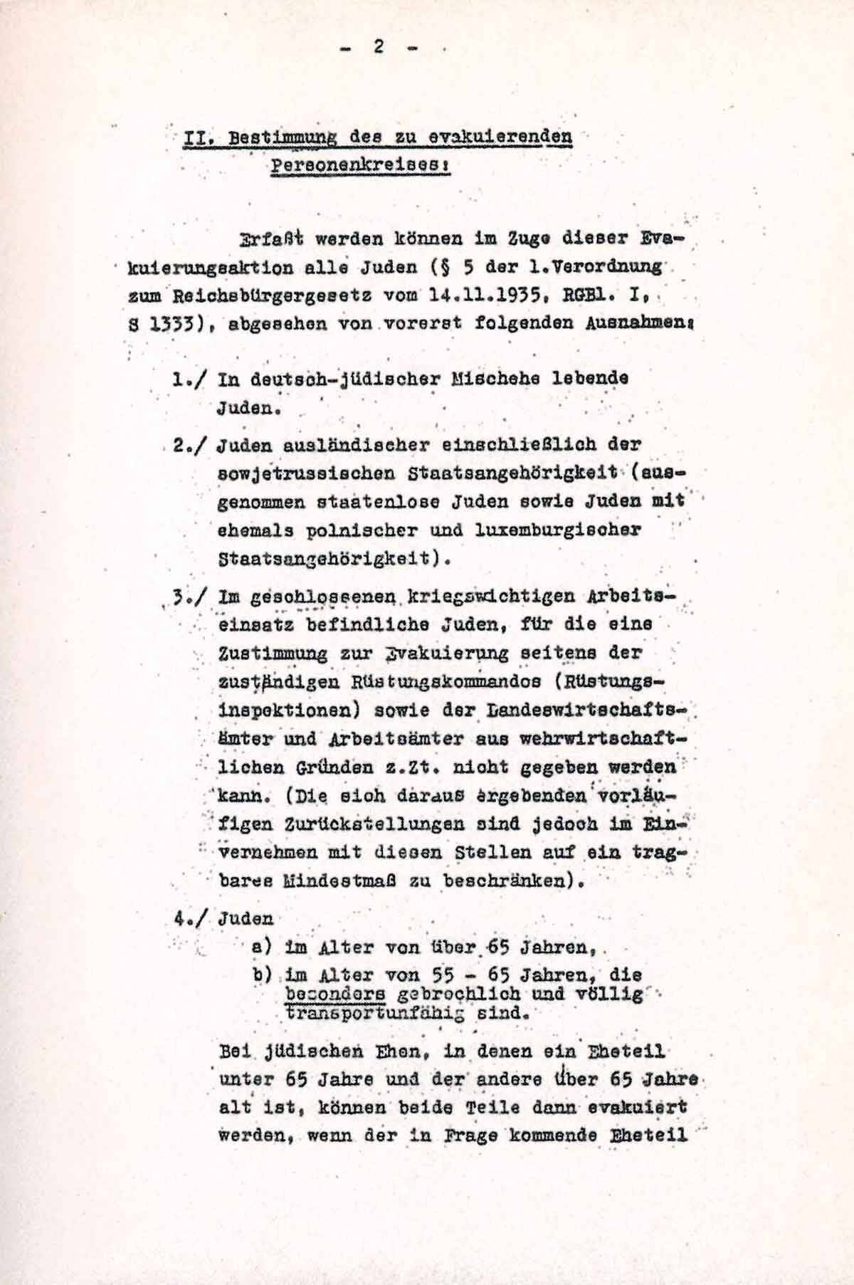 Bei jüdischen Ehen, in denen ein Eheteil unter 65 Jahre und der andere über 65 Jahrs alt ist, können beide Teile dann evakuiert werden, wenn der in Frage kommende Eheteil nicht älter als 67 Jahre ist und ein amtsärztliches Zeugnis für die Arbeitsfähigkeit dieses Eheteiles erbracht werden kann. Weitere Ausnahmen sind auf keinen Fall zulässig. (Für die auf Grund des Alters nicht zu evakuierenden Juden ist später gesonderte Regelung vorgesehen).